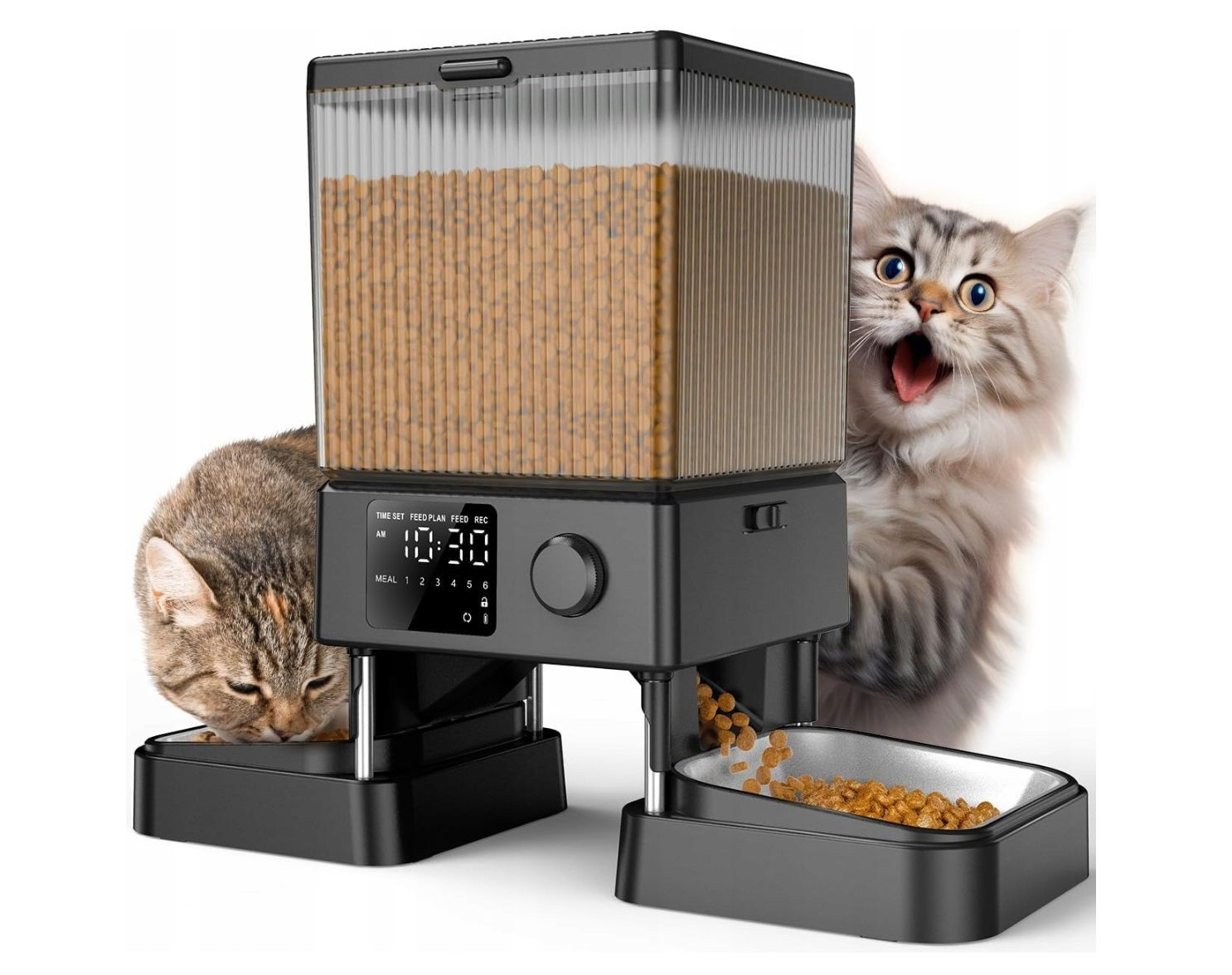 Dzięki dwóm miskom ze stali nierdzewnej i obrotowemu rozdzielaczowi, karmnik umożliwia równoczesne karmienie dwóch zwierząt, niezależnie od ich wielkości i gatunku. Każde z nich otrzyma swoją własną porcję, eliminując problem rywalizacji o jedzenie. To doskonałe rozwiązanie dla domów z dwoma zwierzętami!