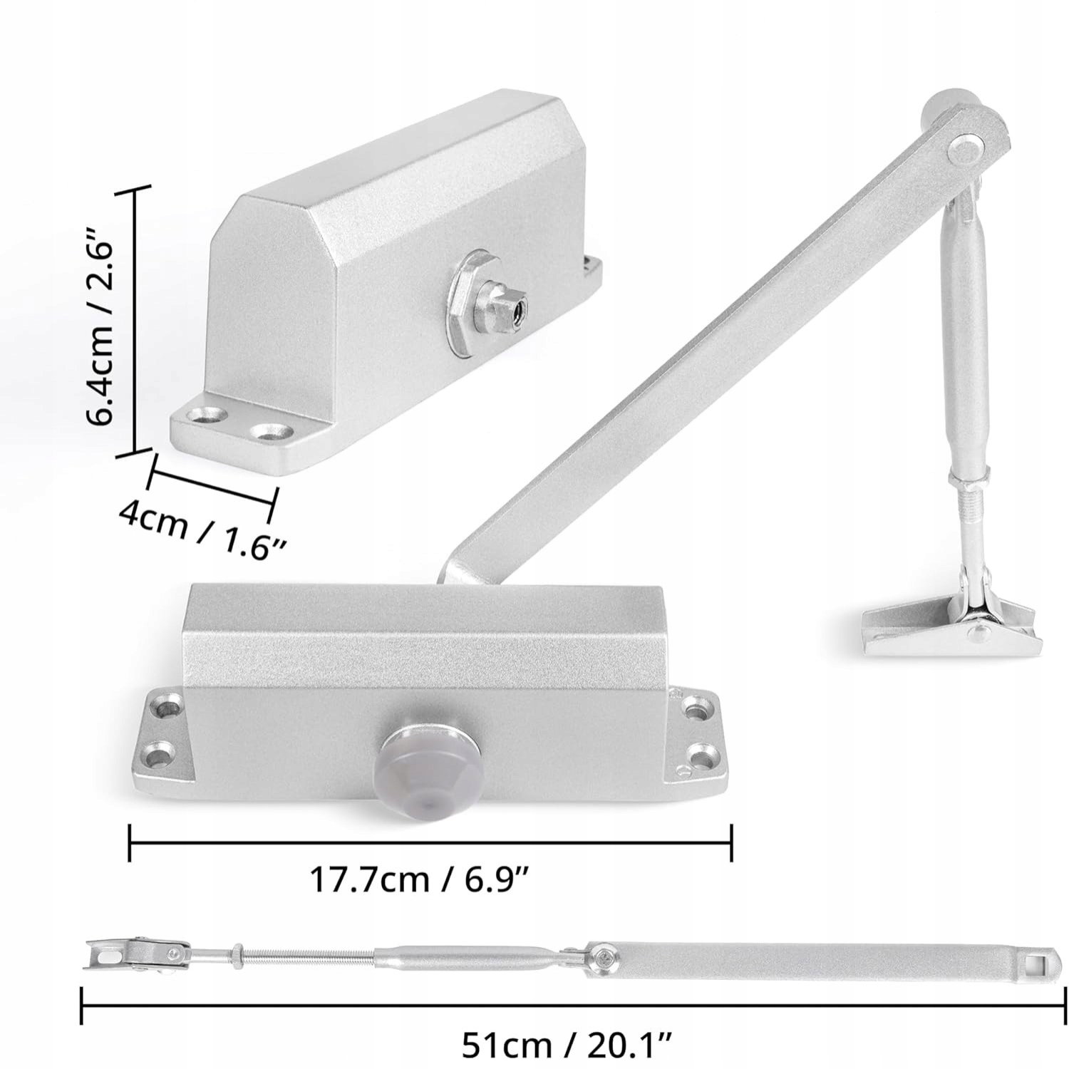 Winter Shore Automatyczny Domknięcie Drzwi - Wiosenny Siłownik Hydrauliczny z Teleskopowym Ramieniem - Mechanizm Rozmiar 3, Regulacja Zasuwy i Szybkości Zamykania - Wytrzymały Stop Aluminium - Srebrny