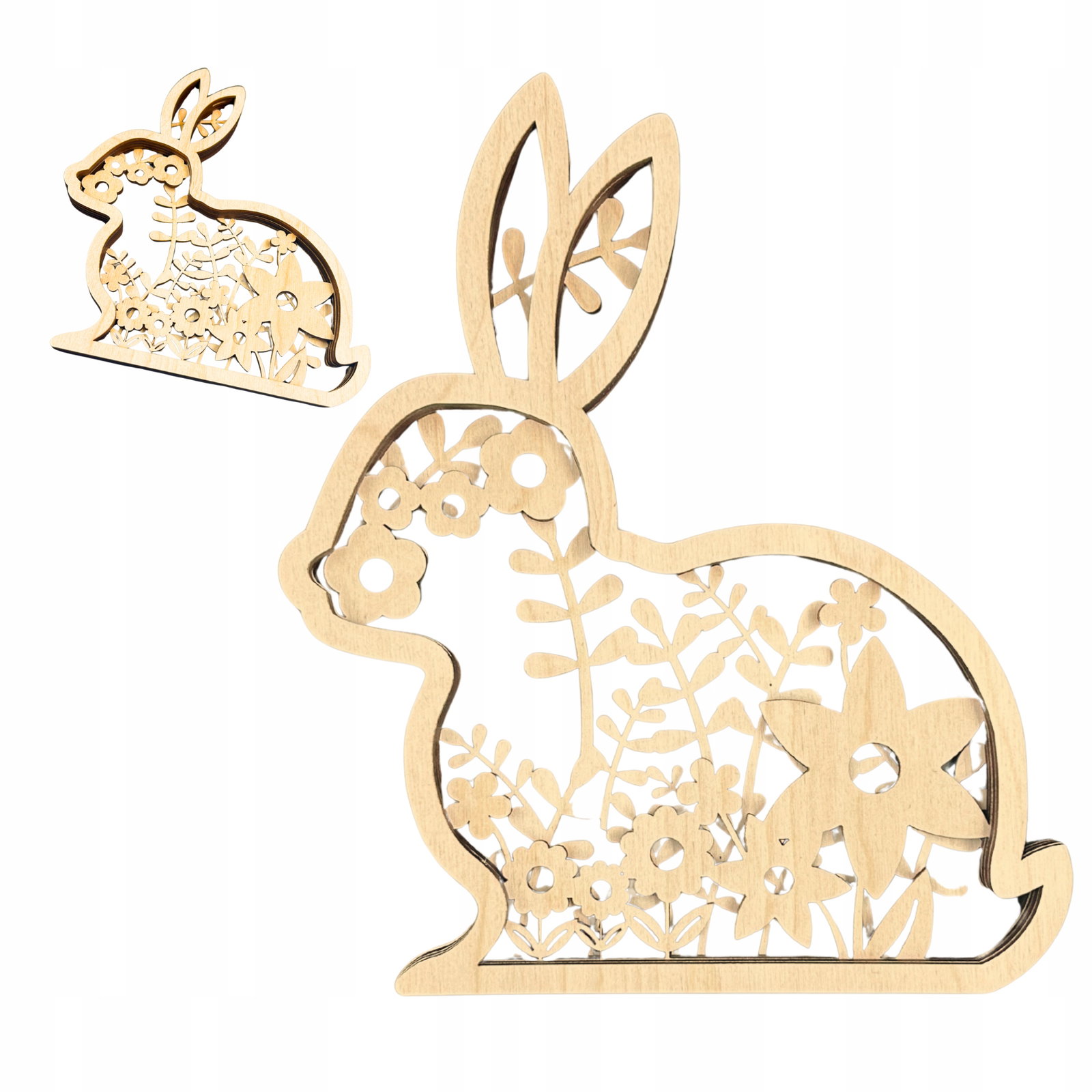 Zając wielkanocny w formacie 3D ze sklejki z ażurowym wzorem "KWIATKAMI" na uroczą dekorację, idealną na wiosenne święta. Wykonanie z wysokiej jakości sklejki, zając wycięty z delikatnymi detalami doskonale wpisuje się w klimat ❤️Wielkanocy❤️. Zając składa się z pięciu elementów, które połączone razem tworzą trójwymiarowy efekt w którym dekoracja ma naturalny wygląd drewna i elegancji. Idealna do dekoracji, rękodzieła i ozdabiania wnętrz!