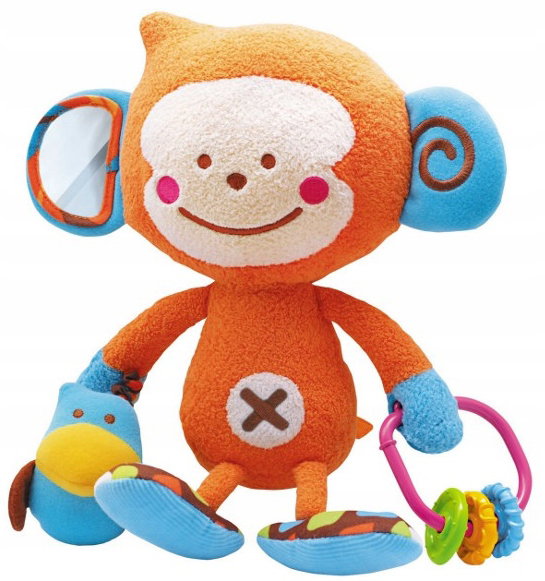 Zabawka wyposażona jest w dwa rodzaje grzechotek oraz kółko do zawieszenia na wózku lub łóżeczku. Ucho małpki to lusterko do przeglądania się. Małpka trzyma w łapkach ptaszka oraz grzechotkę, które są na stałe przymocowane. Potrząśnij głową małpki aby usłyszeć piszczący dźwięk.