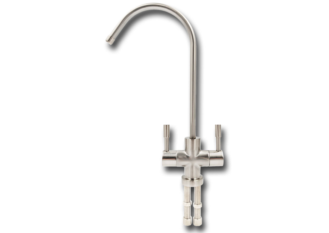 Podwójny, satynowy kranik z zaworami ceramicznymi. Stosowany z systemami odwróconej osmozy z mineralizatorem (RO6) oraz mineralizatorem i jonizatorem (RO7).