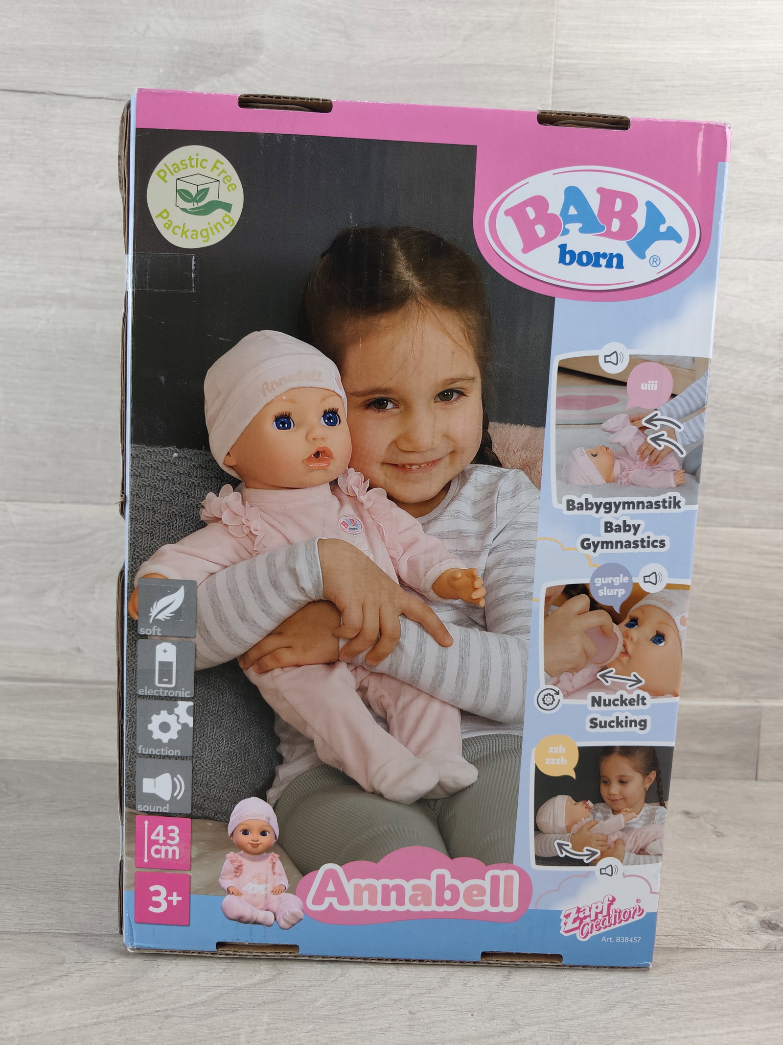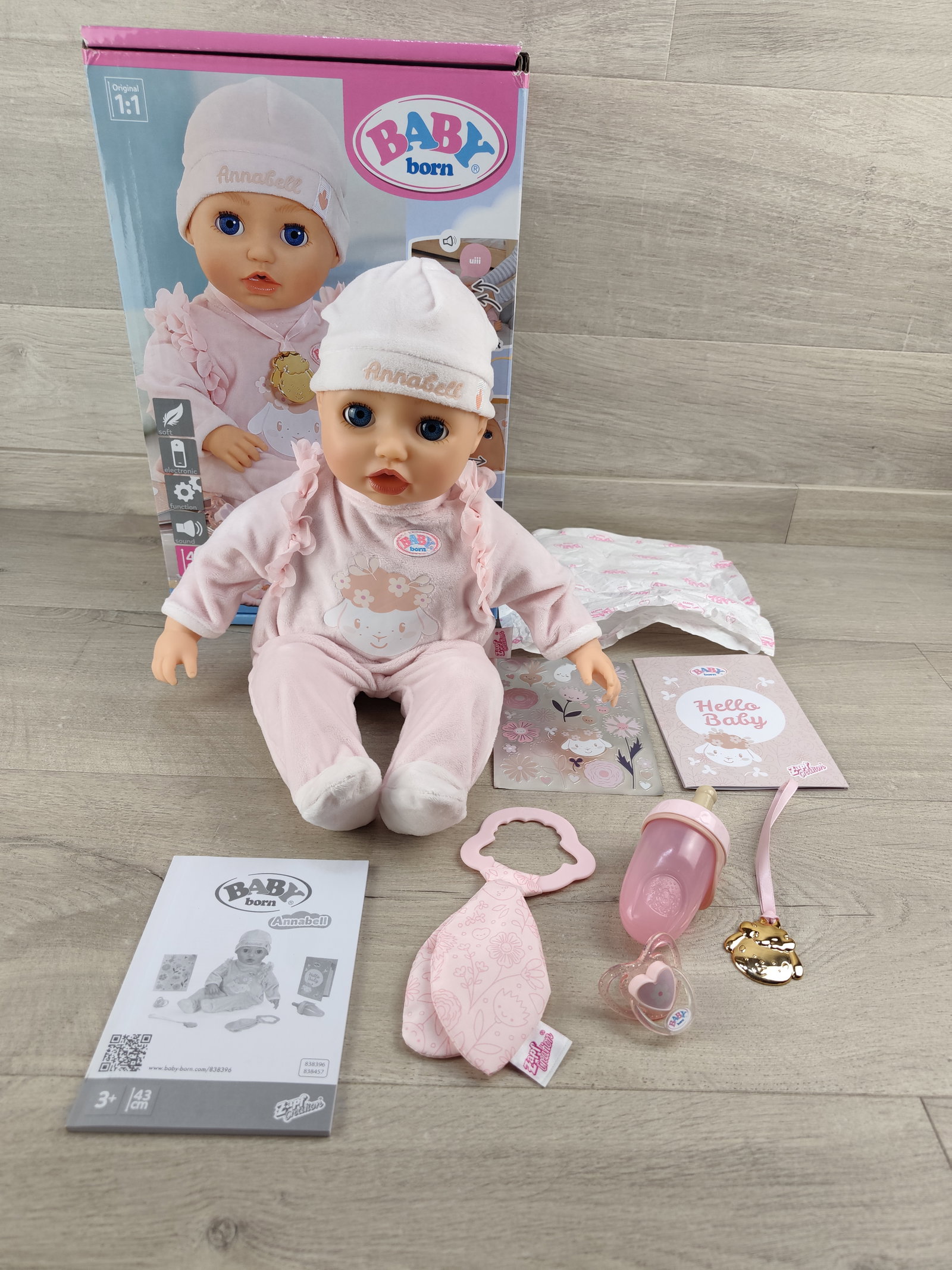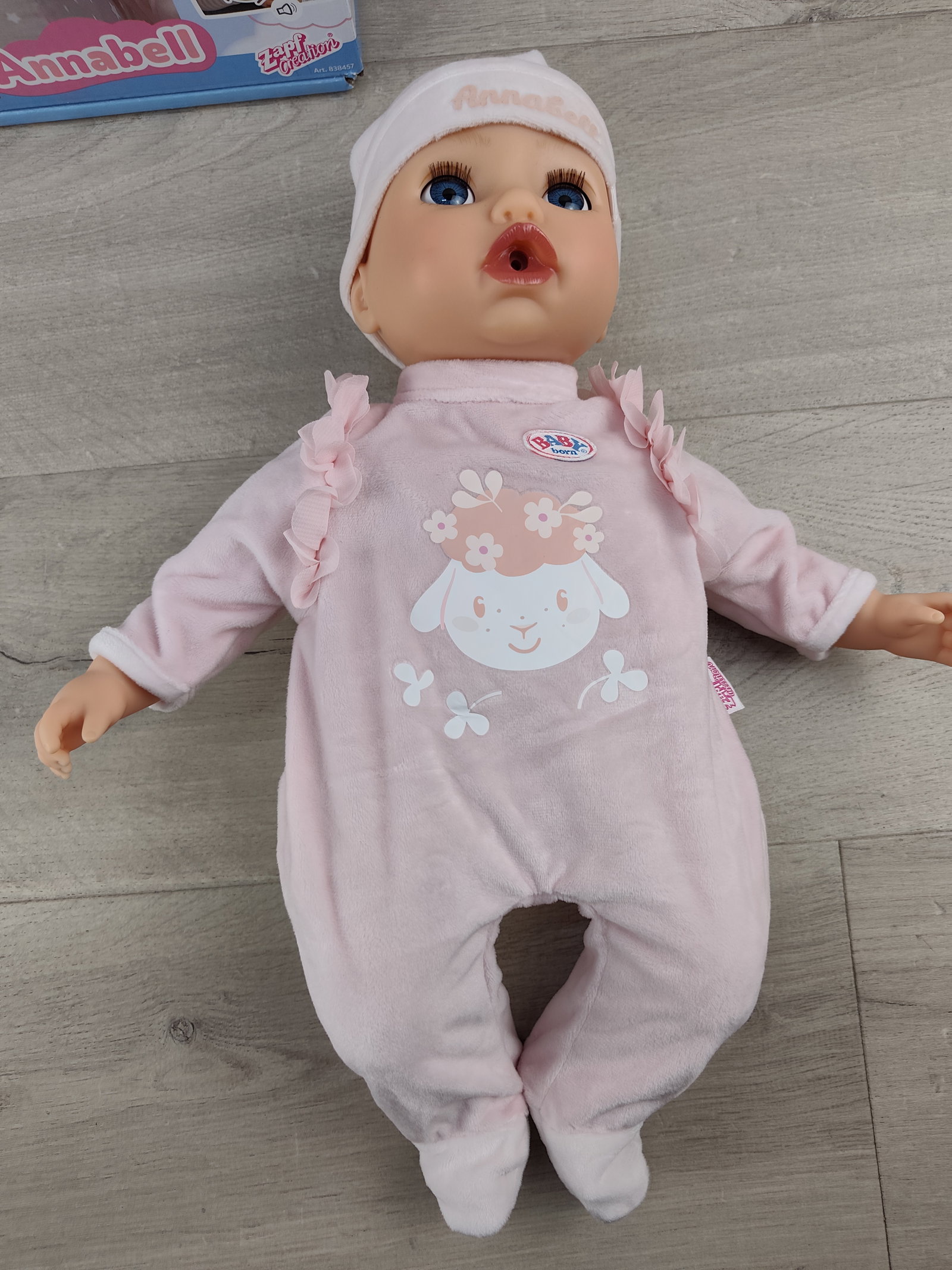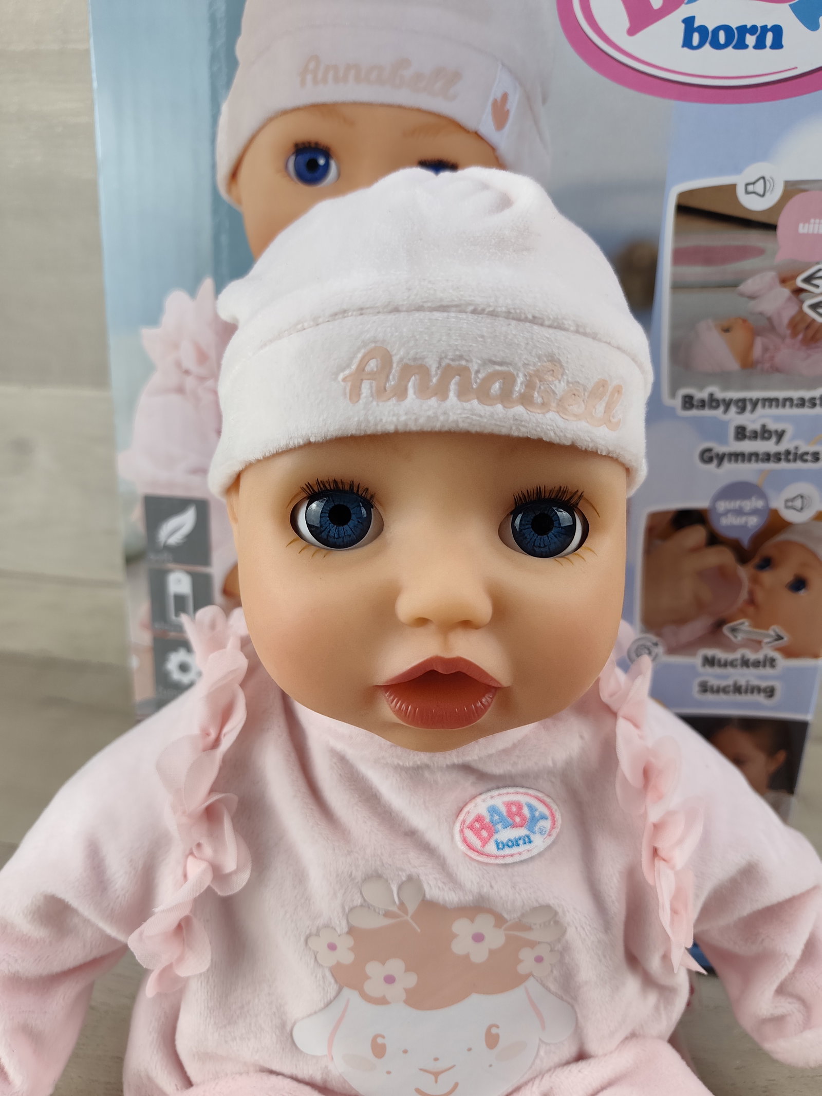 👶 BABY born Annabell 43 cm – interaktywna lalka z miękkim ciałem Annabell to wyjątkowo realistyczna lalka, która reaguje na opiekę dziecka i zachęca do zabawy w codzienne rytuały. Ma miękkie ciało, ruchome kończyny oraz funkcje elektroniczne, dzięki którym wydaje delikatne dźwięki, porusza ustami podczas karmienia i zamyka oczy, gdy jest kołysana do snu.