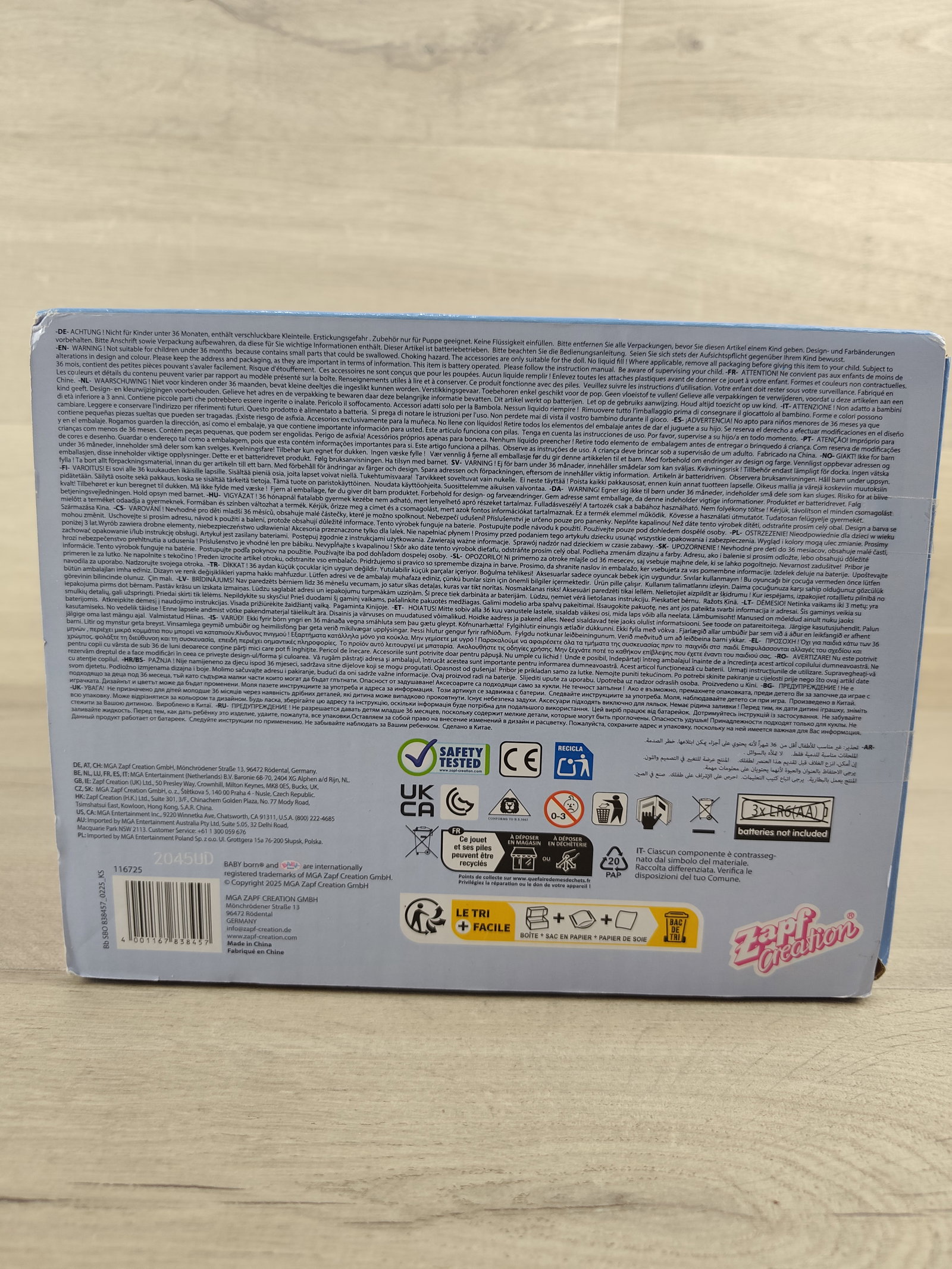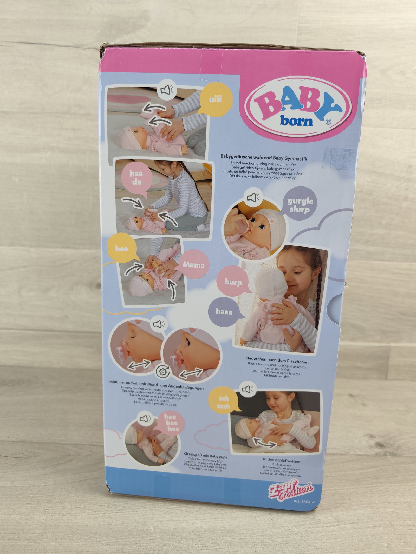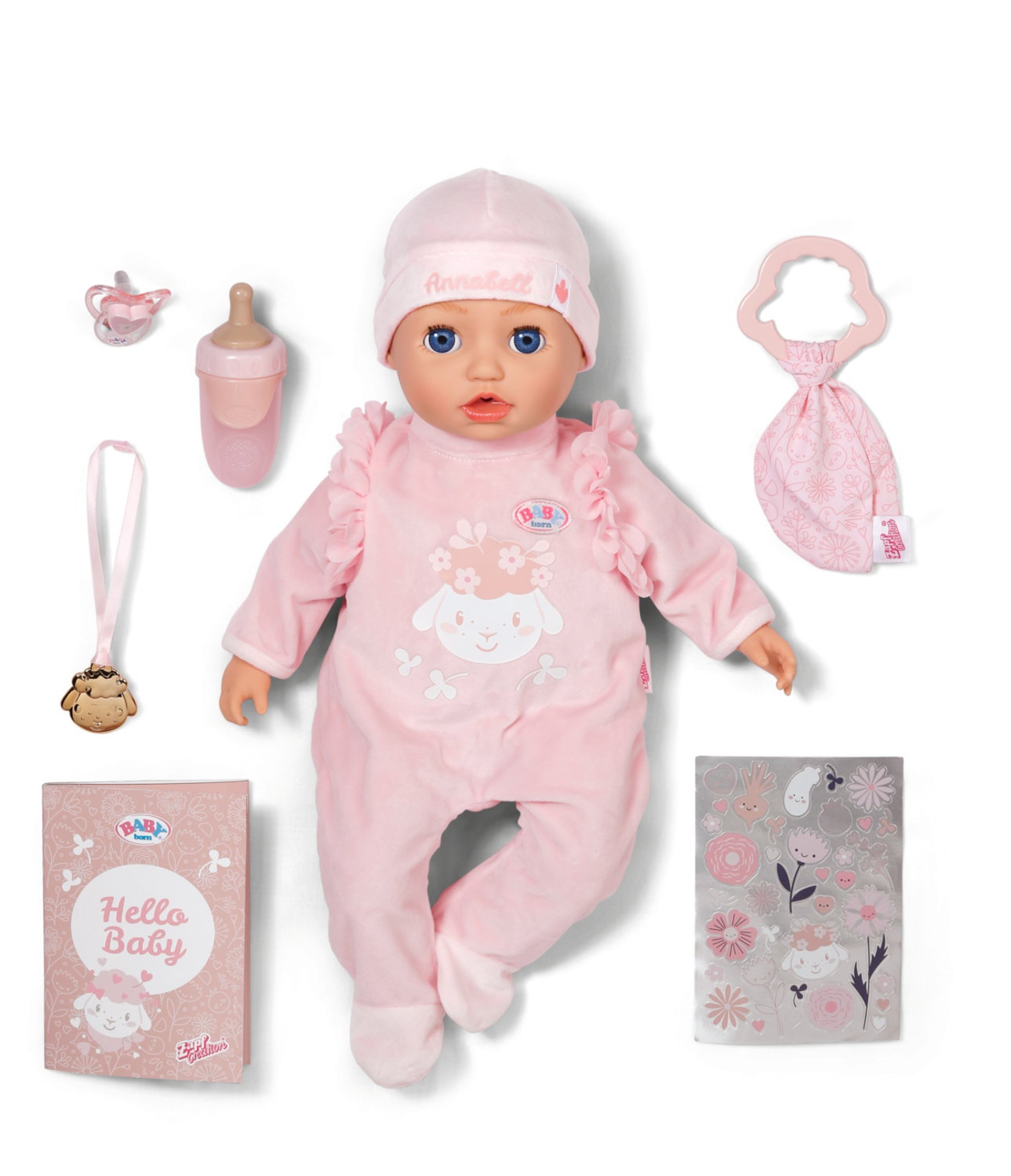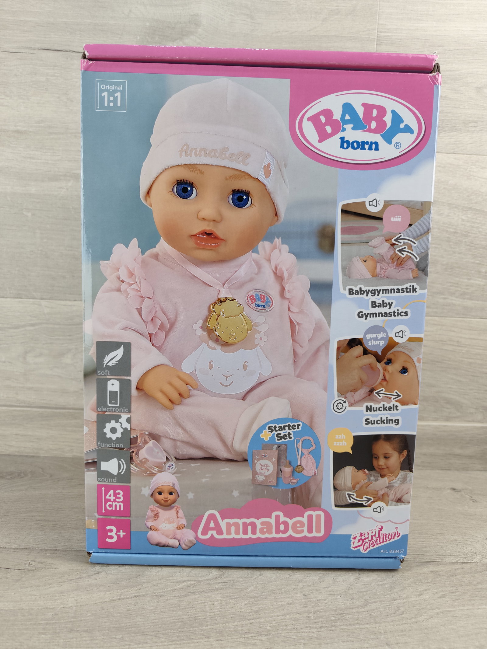 👶 BABY born Annabell 43 cm – interaktywna lalka z miękkim ciałem Annabell to wyjątkowo realistyczna lalka, która reaguje na opiekę dziecka i zachęca do zabawy w codzienne rytuały. Ma miękkie ciało, ruchome kończyny oraz funkcje elektroniczne, dzięki którym wydaje delikatne dźwięki, porusza ustami podczas karmienia i zamyka oczy, gdy jest kołysana do snu.