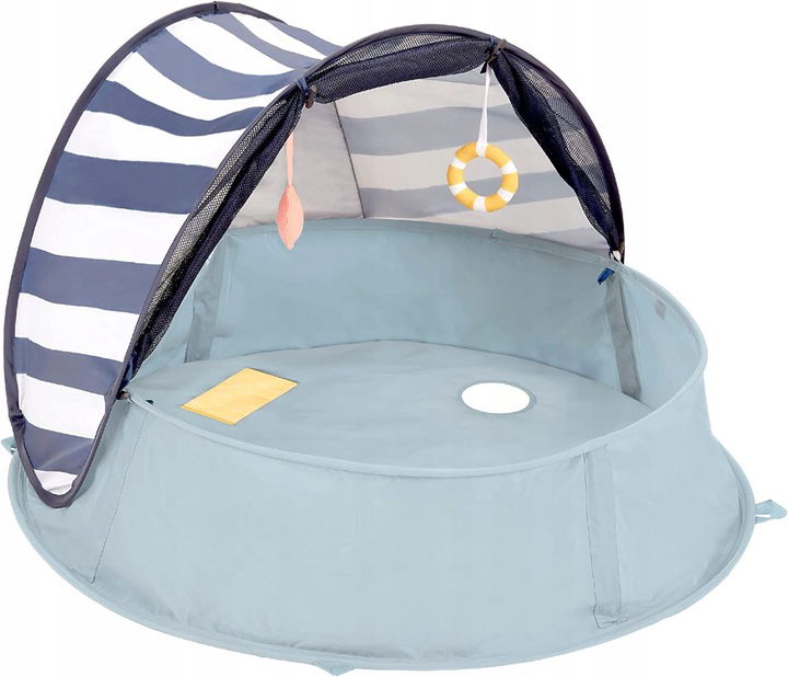 Aquani to rozkładany namiot plażowy dla dzieci, plac zabaw i brodzik. Osłona przeciwsłoneczna blokuje do 99% szkodliwych promieni (UVA i UVB) dzięki wysokiej ochronie tkaniny UPF 50+. Zapewnia również schronienie przed słońcem, wiatrem i piaskiem