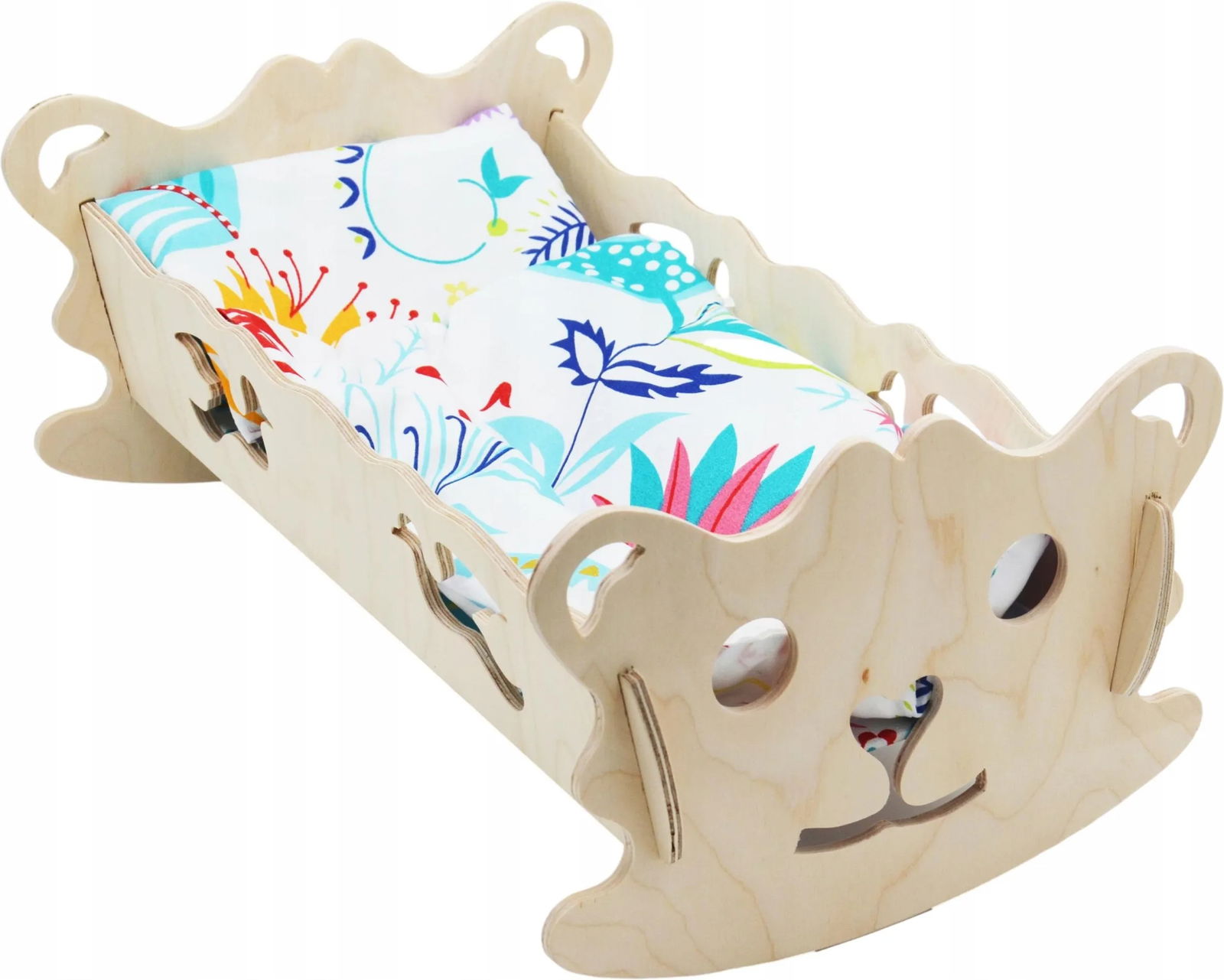 Drewniana kołyska dla lalek z akcesoriami Kołyska charakteryzuje się nie tylko pięknym wyglądem i kształtem ale przede wszystkim została wykonana drewna z niezwykłą dbałością o każdy element. Brak ostrych krawędzi sprawia, że produkt jest w pełni bezpieczny. Opieka nad swoją ukochaną lalą czy misiem to jedna z ulubionych zabaw dziewczynek, a z taką kołyską zabawa dostarczy mnóstwa wrażeń. Dzieci z wielką uwagą i ciekawością obserwują swoich rodziców i próbują wcielać się w rolę dorosłych, zatem warto jest zapewnić zabawki, które dają możliwość wcielenia się w rolę opiekuńczej mamy. Zabawa kołyską pomoże dziecku rozwijać kreatywność oraz wyobraźnię poprzez odgrywanie scenek i ról z życia dorosłych. Ponad to dziecko zdobywa nowe umiejętności, które dadzą mu więcej pewności siebie przy codziennych czynnościach.Kołyska to zabawka, która jest spełnieniem marzeń każdej dziewczynki i nie może go zabraknąć w dziecięcym pokoiku!Kołyskę można dowolnie pomalować według własnego uznania.Kołyska pomieści lalkę o długości 50 cm!