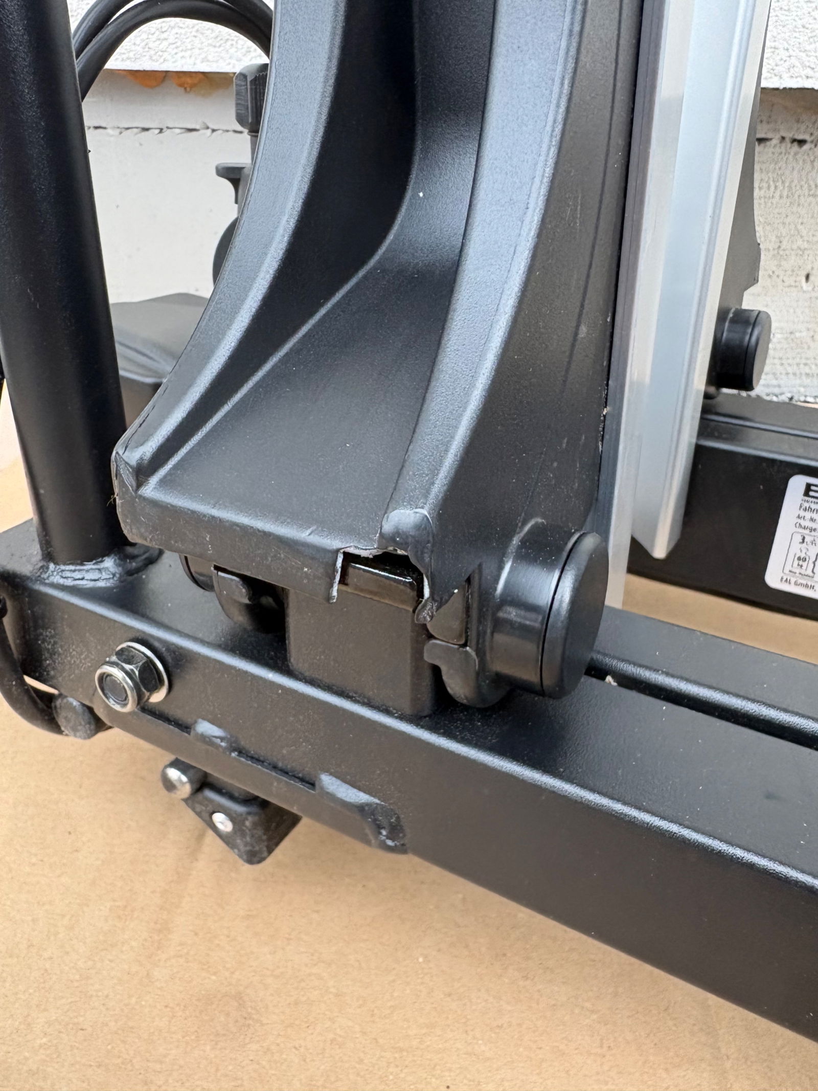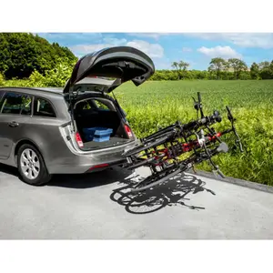 Do transportu 3 rowerów na drążku Mechanizm składania: tak, z pedałem nożnym Mocowanie rowerów: wyjmowany i zamykany uchwyt ramy, korek koła z paskami mocującymi i blokada zacisku Zamykany uchwyt ramy: tak Typ szyny: aluminiowe szyny profilowe. Rozstaw szyn: ok. 22 cm. Rozstaw osi: max. 130 cm. Max. Szerokość opony w szynie: do 3 cali. Gotowy do użycia w zaledwie 3 krokach