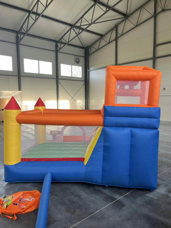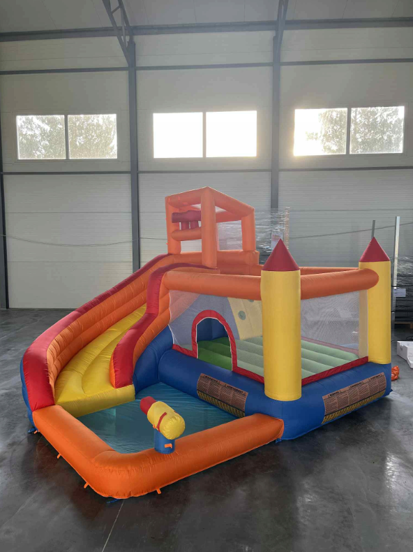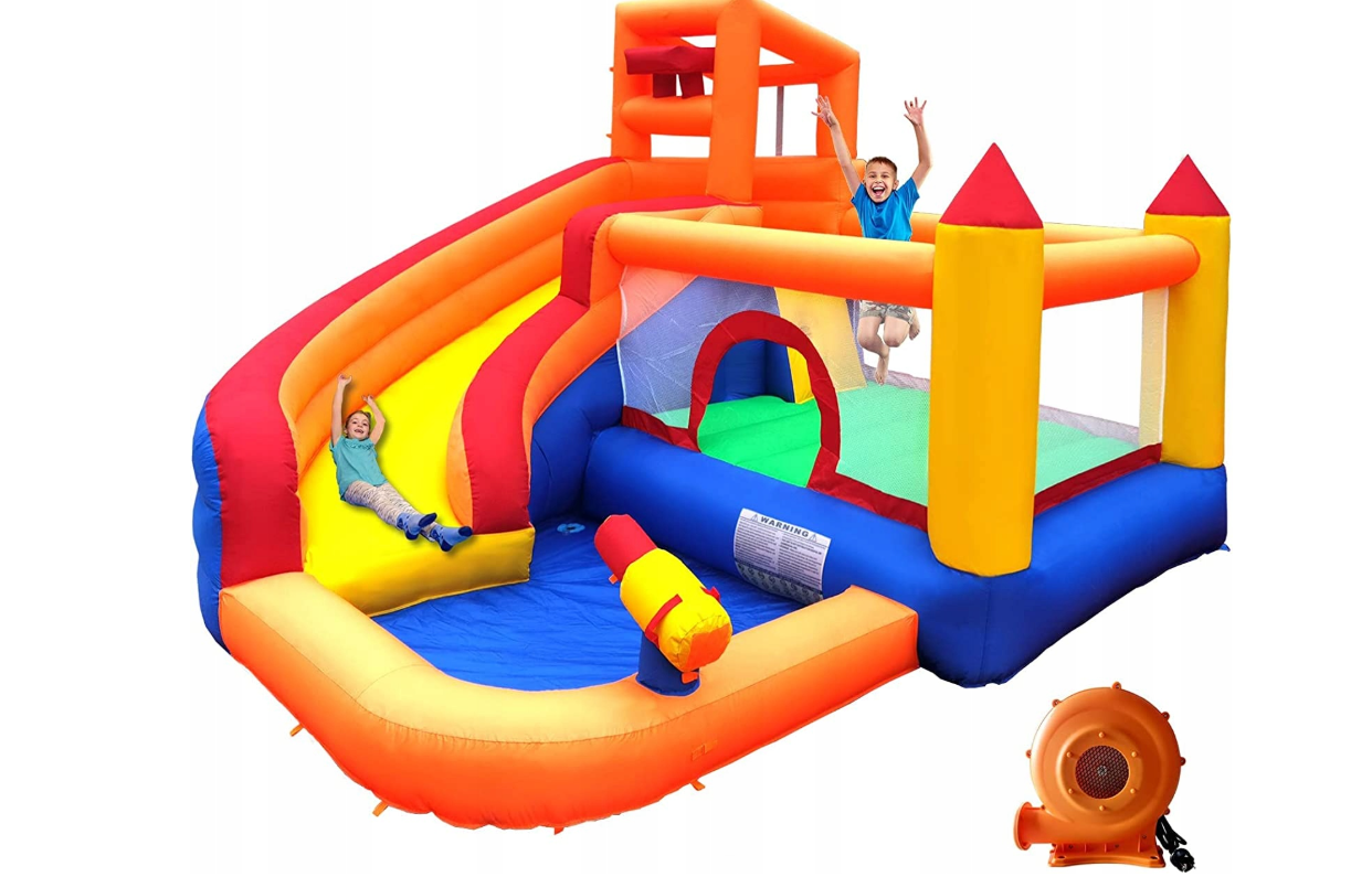 Podaruj ten dmuchany zamek jako prezent dla swoich dzieci. Dzięki dużej powierzchni do skakania oraz zjeżdżalni, wieży i małemu basenikowi z pistoletem wodnym może pomieścić jednocześnie conajmniej 3 dzieci, które będą się świetnie bawić, skacząc, leżąc, zjeżdzając, kąpiać się i śmiejąc się. Bezpieczeństwo jest bardzo ważne, dlatego zastosowaliśmy tkaniny Oxford 420D i 840D. Mocowania zwiększają stabilność.