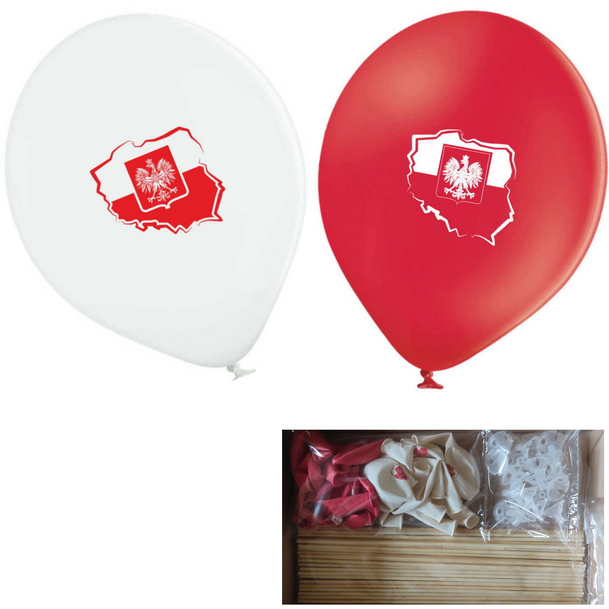 • 10 białych balonów z czerwonym zarysem polski i Godłem.