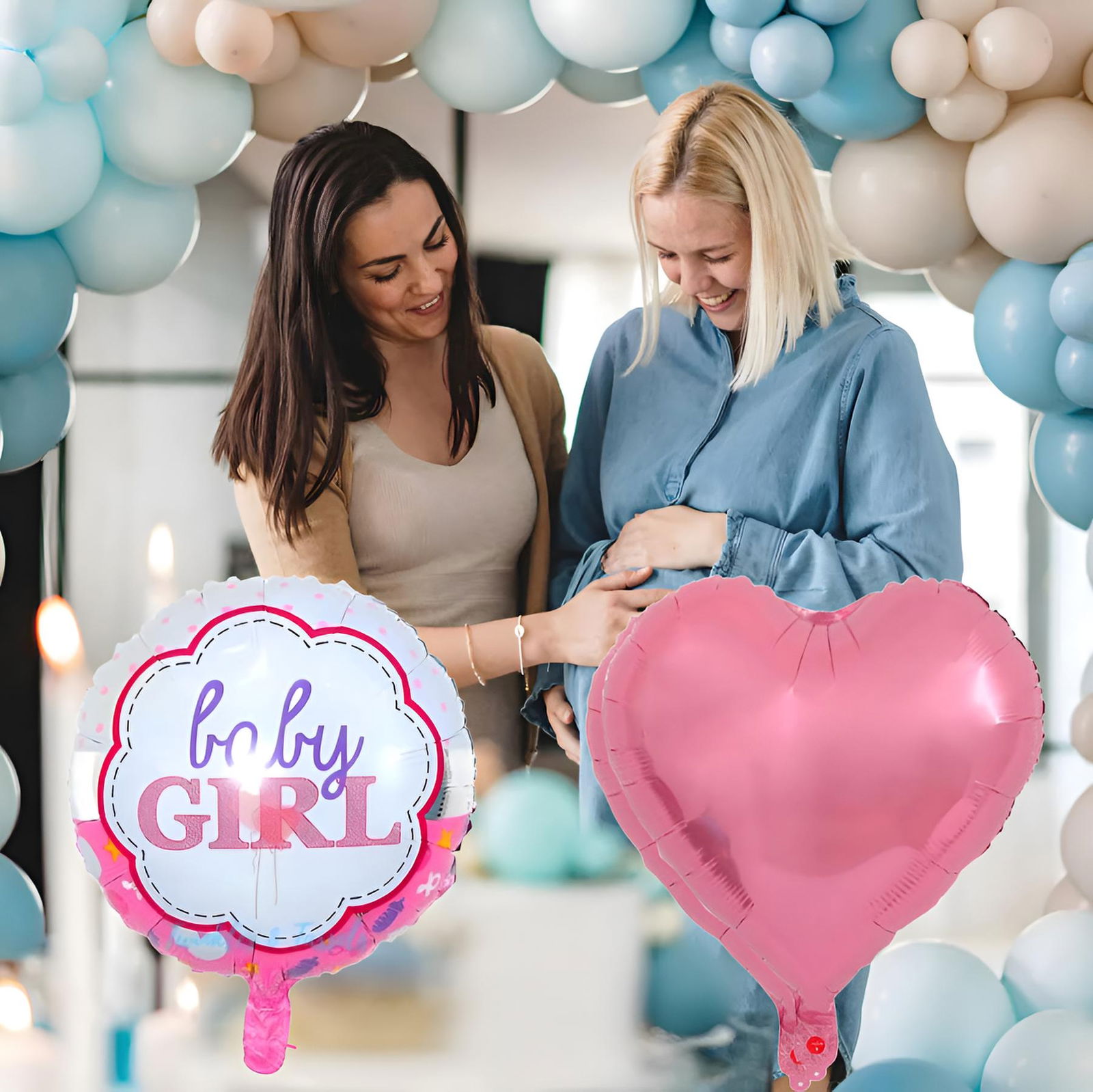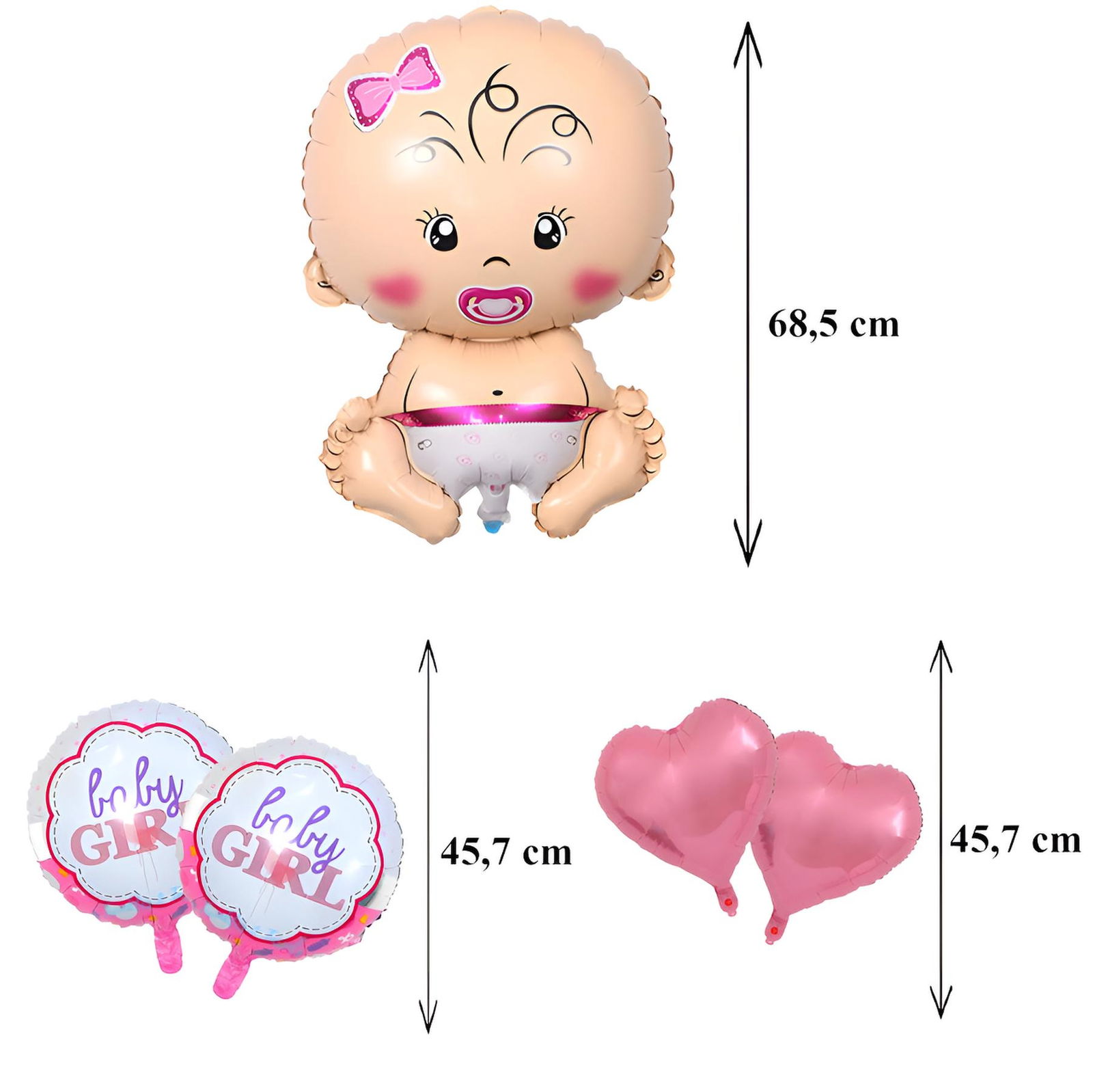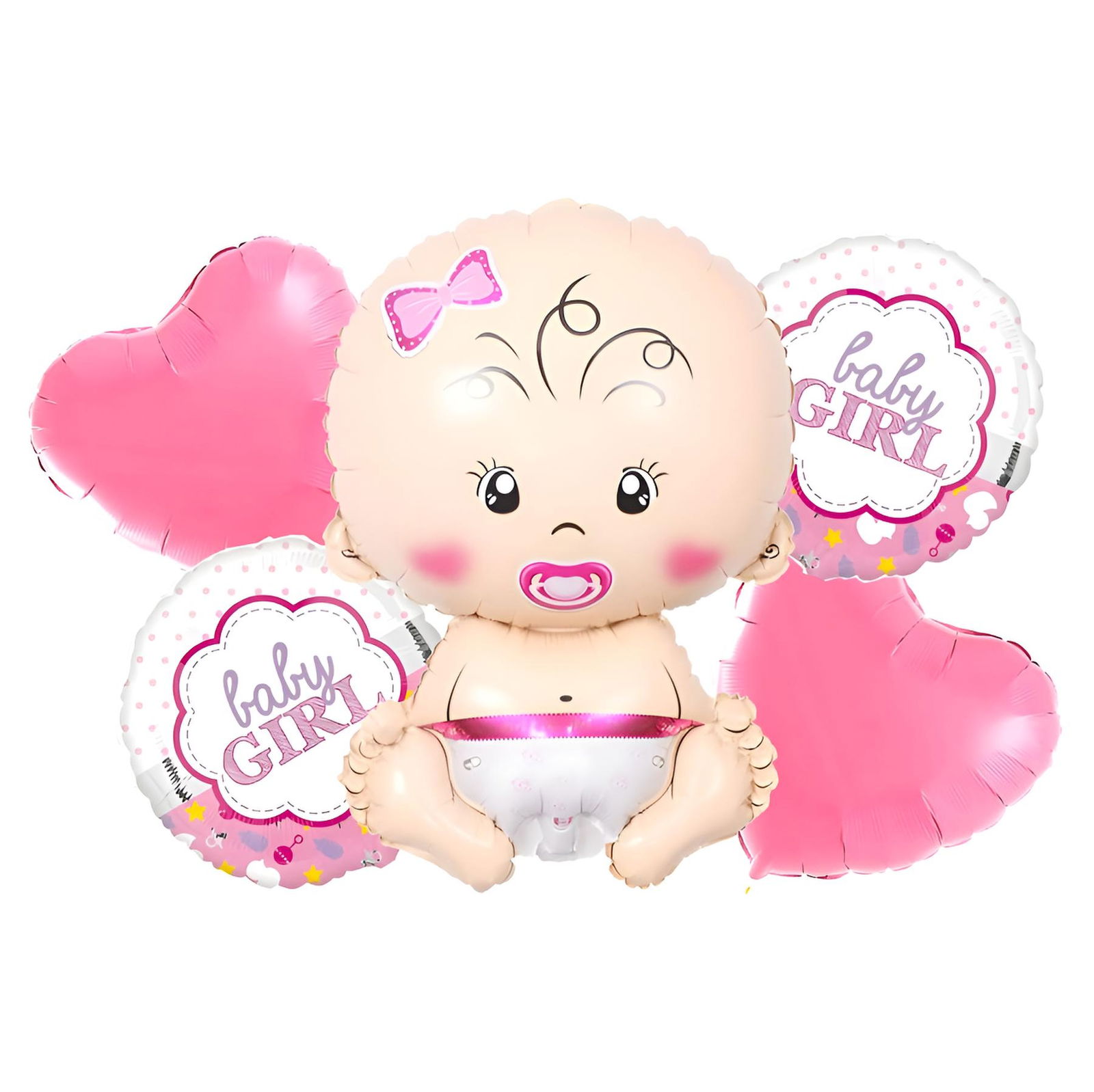 ? Kompletny zestaw 5 balonów foliowych – zawiera bobasa, gwiazdki i napis „Baby Girl”.
