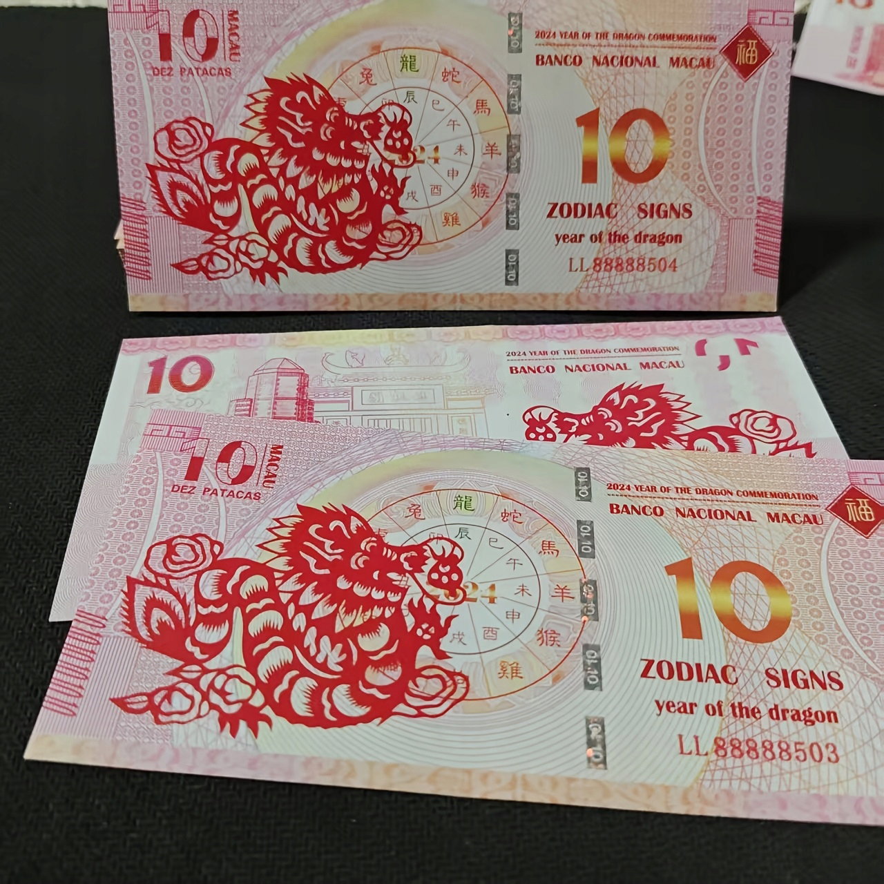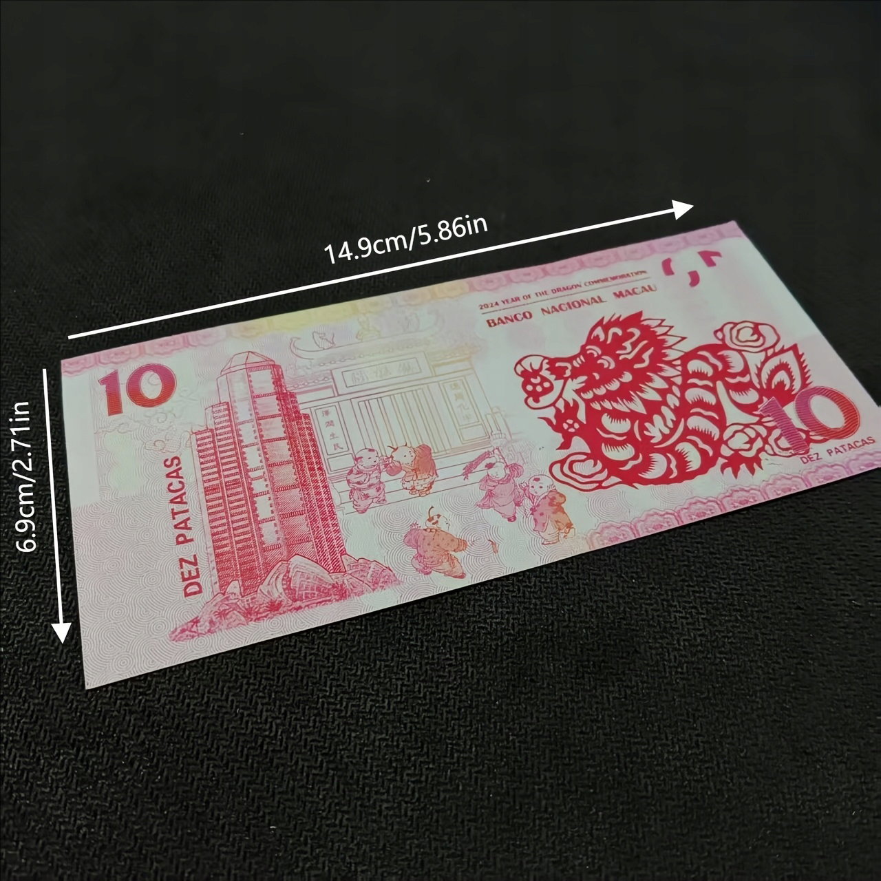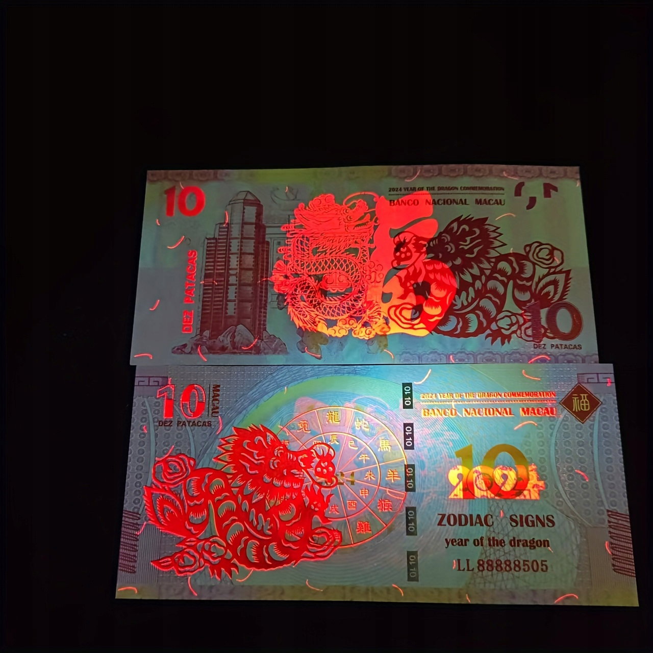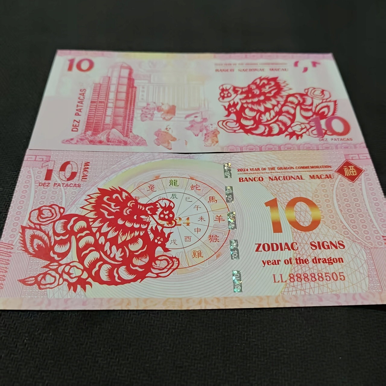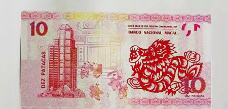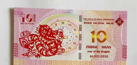 To banknot o nominale 10 Patacas, wydany specjalnie z okazji Chińskiego Nowego Roku 2024 - Roku Smoka. Jest naprawdę piękny i ma bardzo ciekawe motywy!
