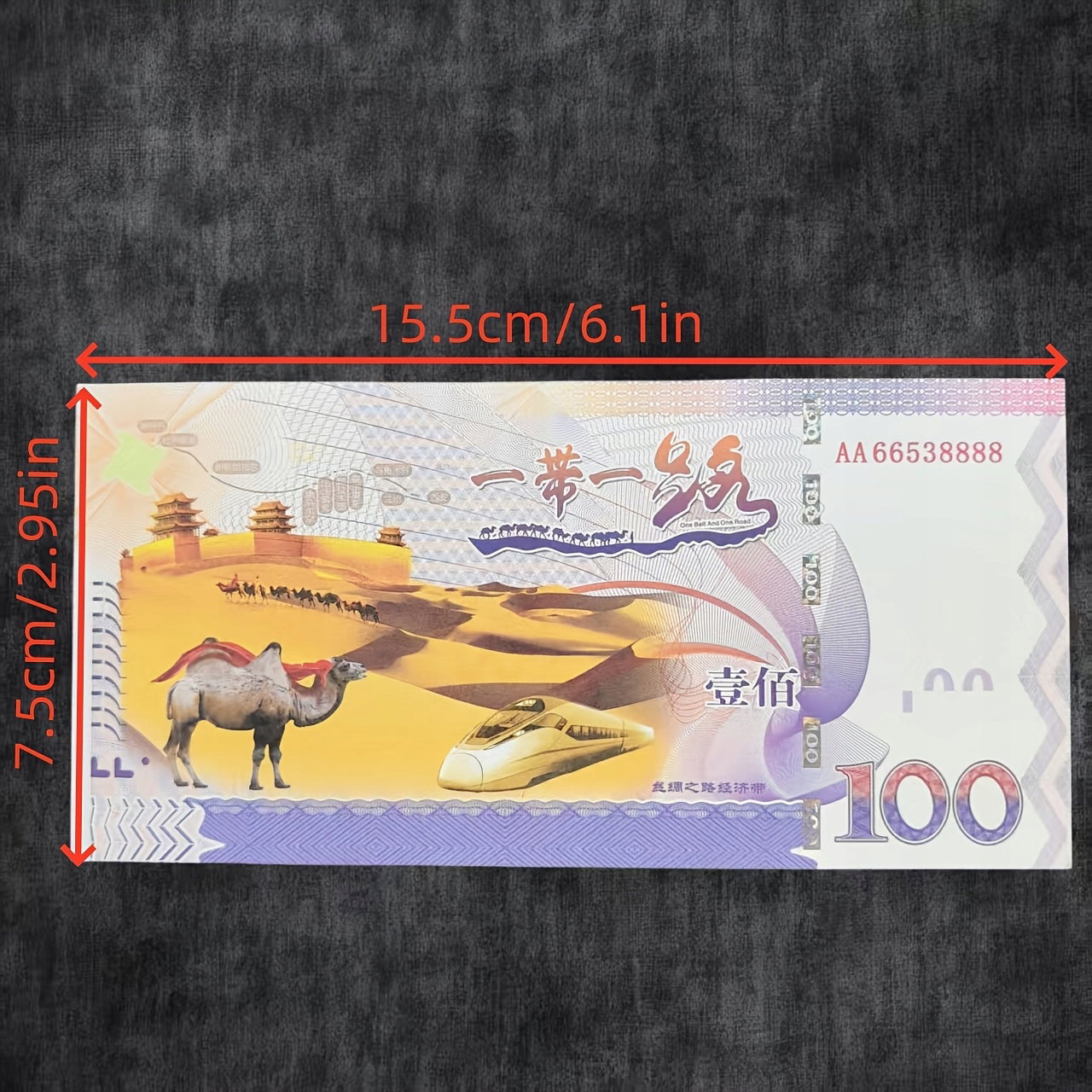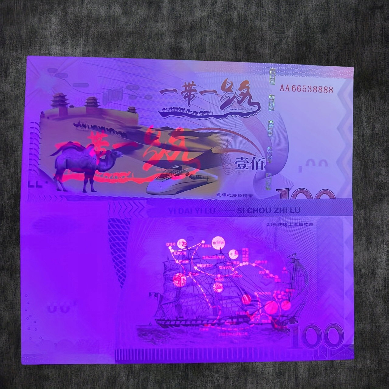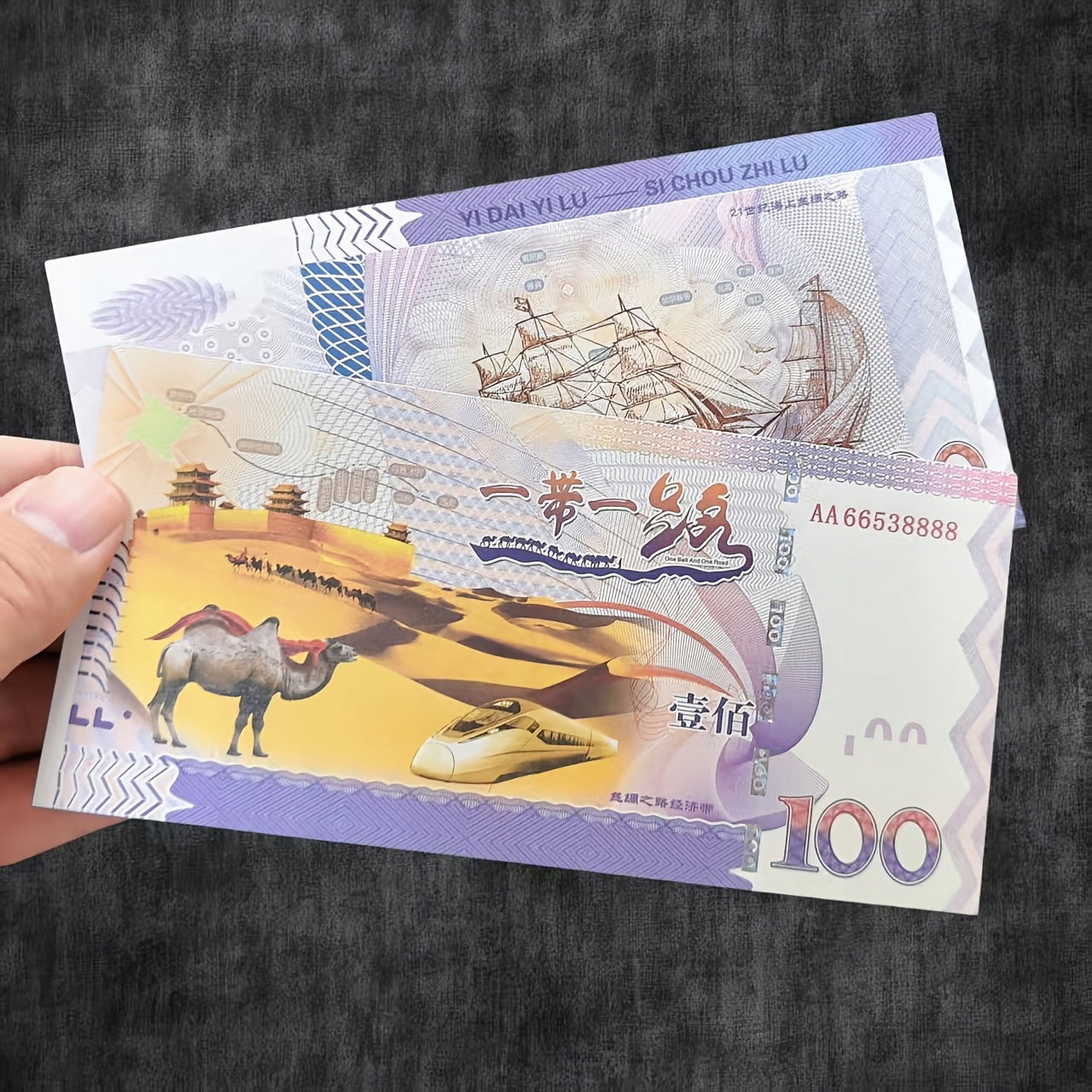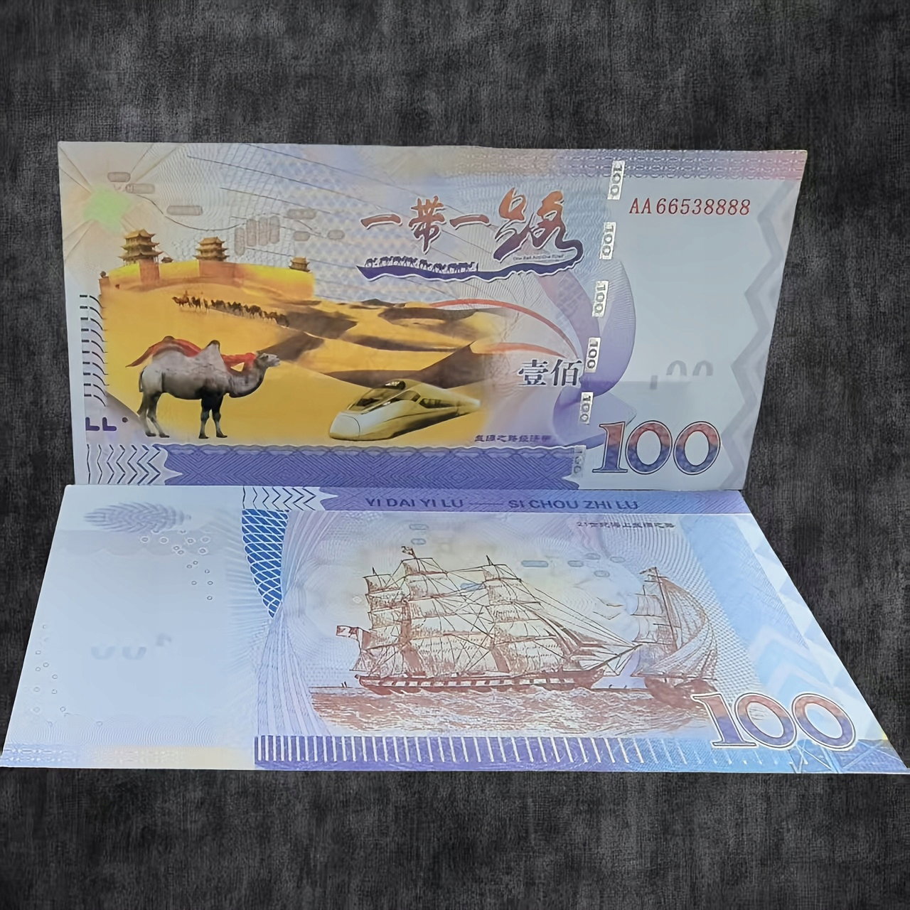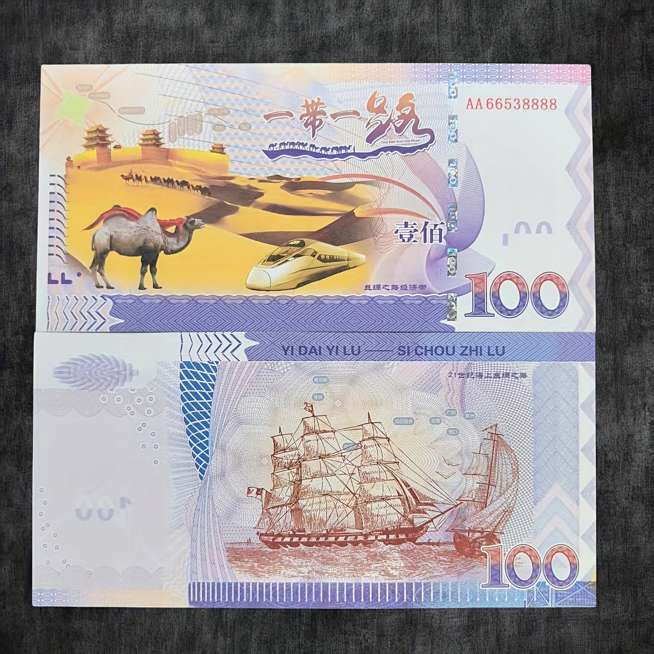 - Wzornictwo: Banknot wyróżnia się bogatą i symboliczną grafiką. Na awersie przedstawiono nowoczesne i historyczne aspekty Jedwabnego Szlaku:Pustynny krajobraz z wielbłądem: Symbolizuje tradycyjne, lądowe szlaki handlowe.Szybki pociąg: Reprezentuje nowoczesne, innowacyjne podejście do transportu i globalnej łączności.Zabytkowa architektura: Nawiązuje do bogatej historii i dziedzictwa kulturowego regionu.Napisy w języku chińskim i pinyin (YI DAI YI LU - JEDWABNY SZLAK), które są centralnym motywem banknotu.Numer seryjny: Widoczny numer , który dodaje banknotowi unikalności.