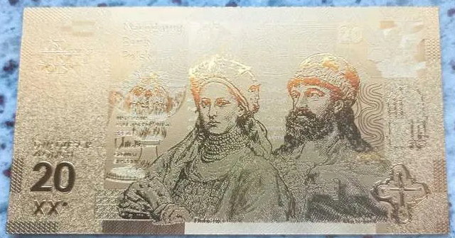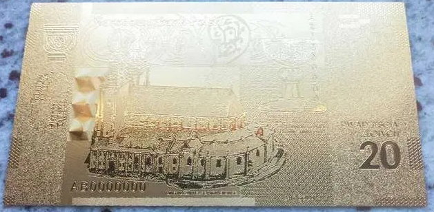 Unikalny, pozłacany banknot kolekcjonerski o nominale 20 zł . Wykonany z wysokiej jakości materiałów, prezentuje się elegancko i luksusowo. Na banknocie znajduje się szczegółowe zdobienia.
