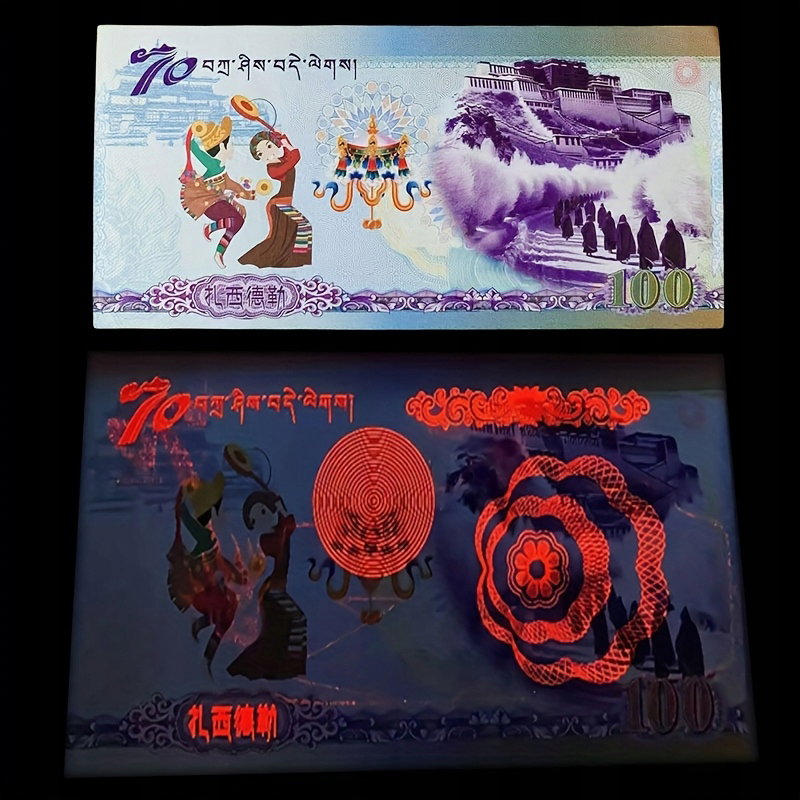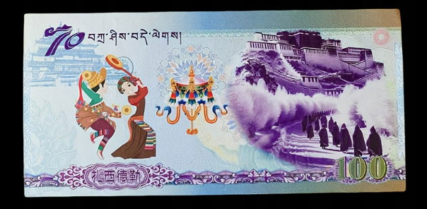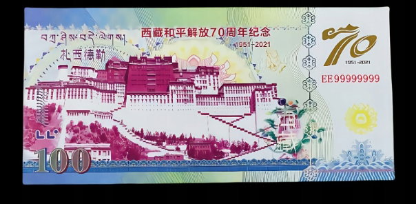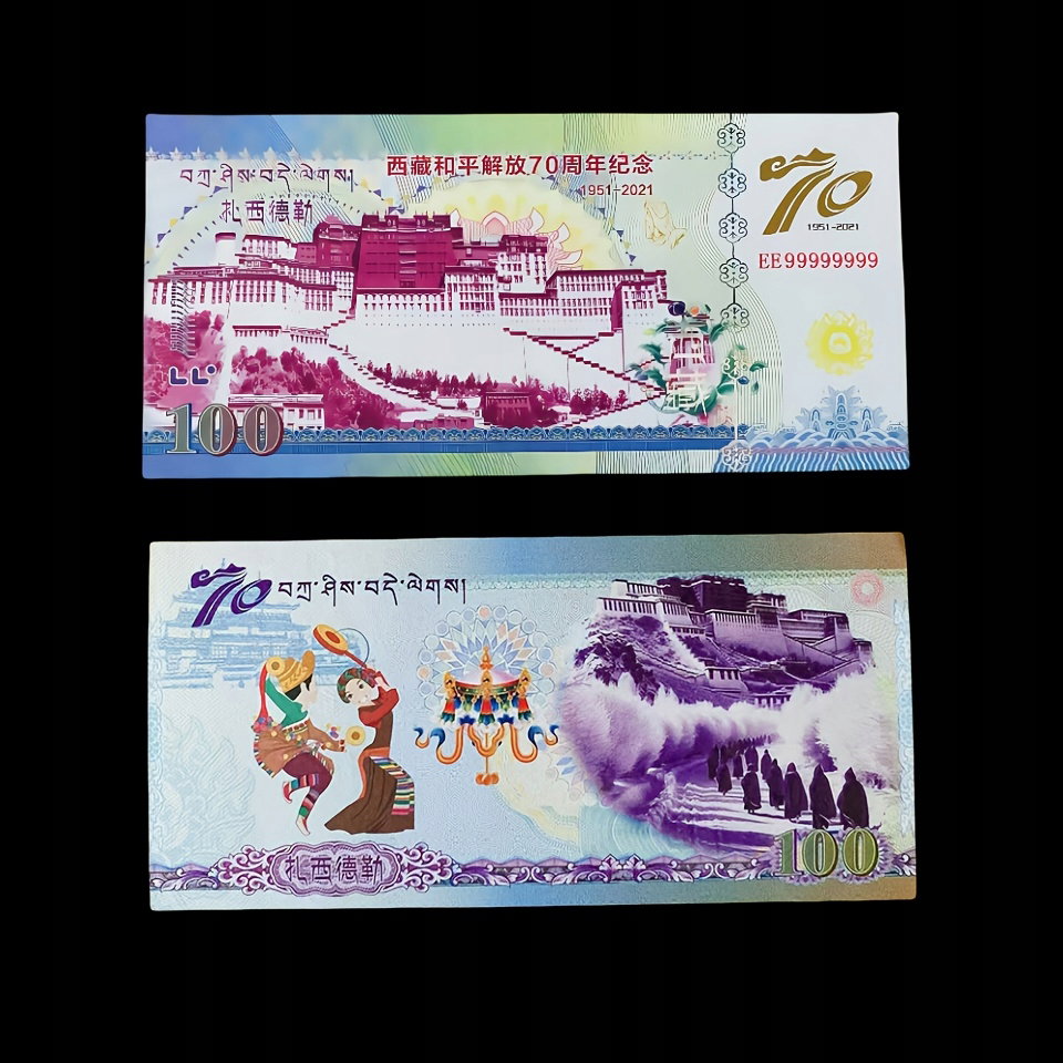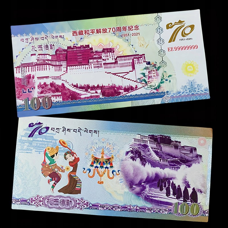 To banknot upamiętniający 70. rocznicę pokojowego wyzwolenia Tybetu (lata 1951-2021). Jest naprawdę piękny i pełen detali!