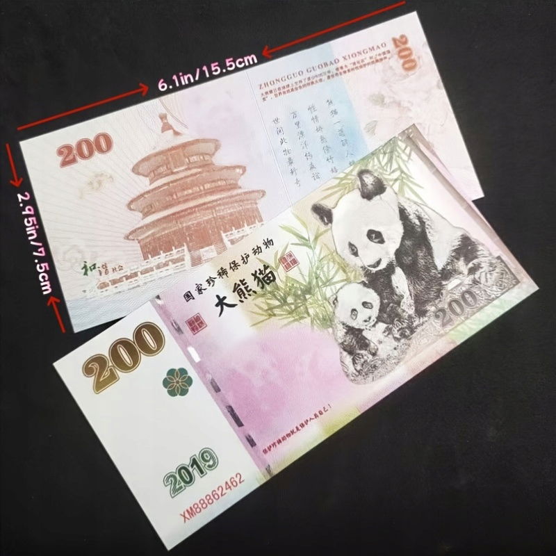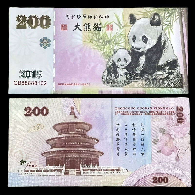- Awers: Wizerunek Pandy Wielkiej z młodym na tle bambusów. Napisy w języku chińskim: "國家珍稀保護動物" (Narodowe Rzadkie Zwierzę Chronione) oraz "大熊貓" (Wielka Panda). Rok 2019 i unikalny numer seryjny. Po lewej stronie nominał 200.