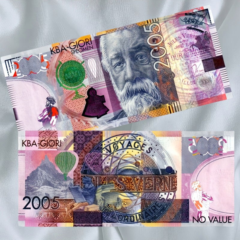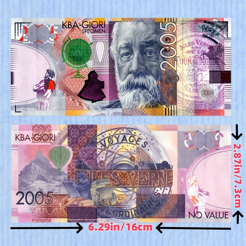 Rewers: Na rewersie banknotu widać motywy z książek Verne'a, w tym latający balon i tajemniczy pojazd. Dodatkowo umieszczono napis "Voyages Extraordinaires" (Nadzwyczajne podróże) oraz rok wydania 2005.