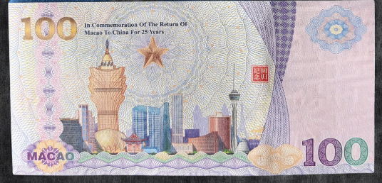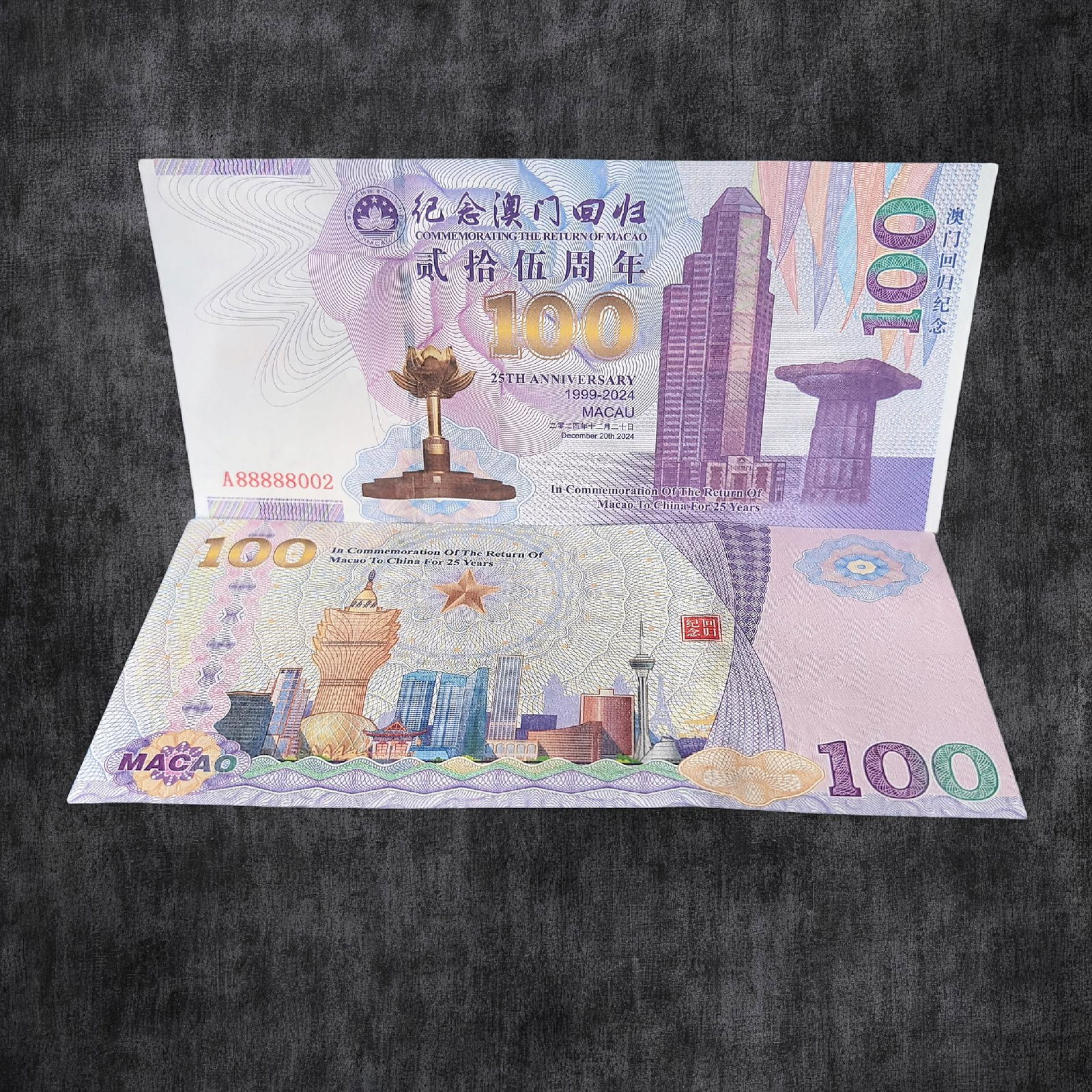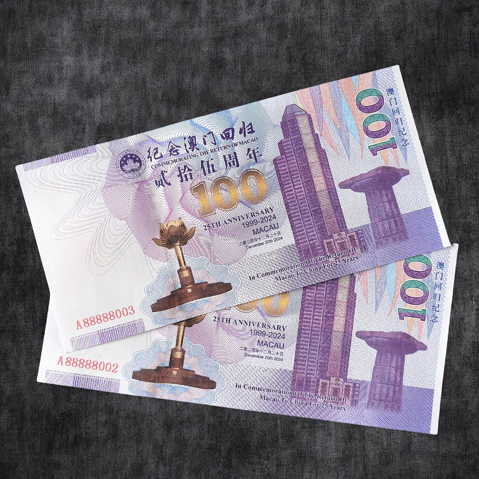 - Motyw: Banknot upamiętnia ważny moment w historii Makau, prezentując charakterystyczne dla regionu symbole i budowle. Na awersie widoczna jest stylizowana rzeźba lotosu oraz drapacze chmur, a także napis "COMMEMORATING THE RETURN OF MACAO 25TH ANNIVERSARY 1999-2024 MACAU". Rewers banknotu ukazuje panoramę Makau z takimi obiektami jak Wieża Makau i inne charakterystyczne budynki.