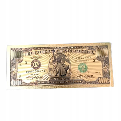 Unikalny, pozłacany banknot kolekcjonerski o nominale 1 000 000 dolarów. Wykonany z wysokiej jakości materiałów, prezentuje się elegancko i luksusowo. Na banknocie znajduje się wizerunek Statuy Wolności oraz szczegółowe zdobienia.