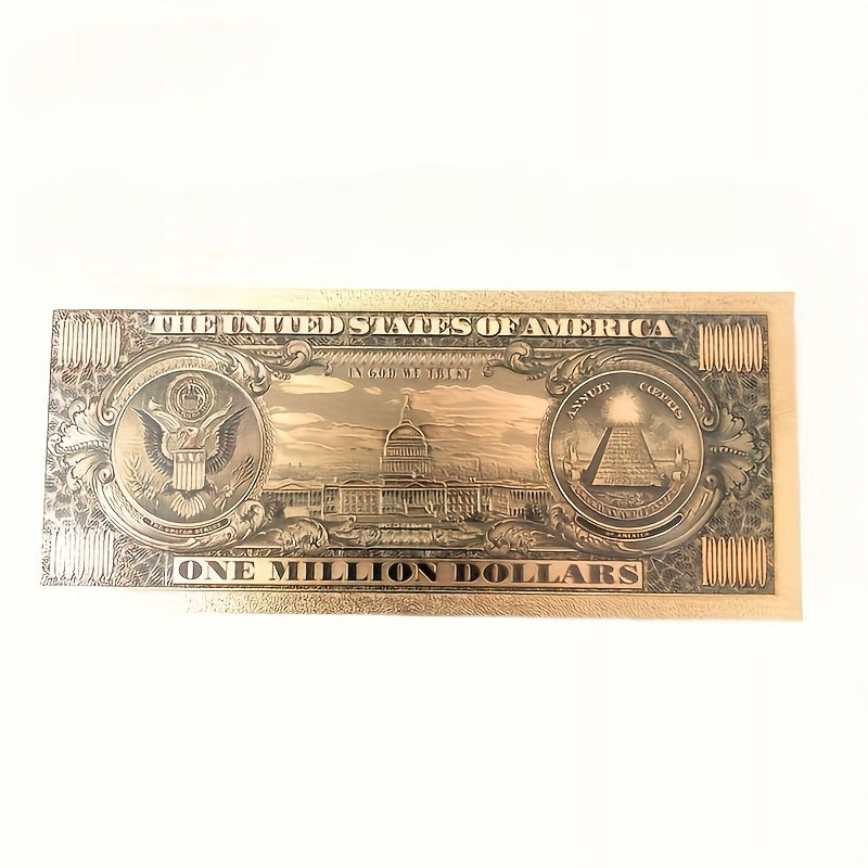 Unikalny, pozłacany banknot kolekcjonerski o nominale 1 000 000 dolarów. Wykonany z wysokiej jakości materiałów, prezentuje się elegancko i luksusowo. Na banknocie znajduje się wizerunek Statuy Wolności oraz szczegółowe zdobienia.