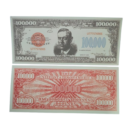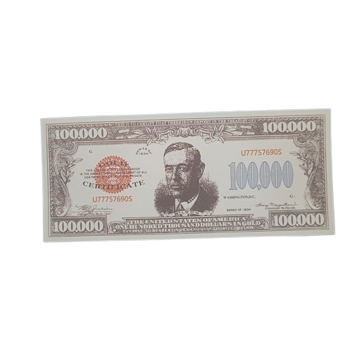 Przedmiotem jest replika banknotu o najwyższym nominale w historii Stanów Zjednoczonych – 100 000 dolarów z 1934 roku. Ten niezwykły banknot, przedstawiający prezydenta Woodrowa Wilsona, nigdy nie był w obiegu publicznym i służył jedynie do transakcji między bankami Rezerwy Federalnej. Oferowany banknot to doskonała replika kolekcjonerska, idealna dla: Pasjonatów historii i numizmatyki Kolekcjonerów amerykańskich banknotów Osób poszukujących unikatowych pamiątek Na oryginalny i nietuzinkowy prezent Cechy oferowanego banknotu: Nominał: 100 000 Dolarów Rok emisji: 1934 (replika) Wizerunek: Prezydent Woodrow Wilson Walor: Kolekcjonerski, nie jest środkiem płatniczym Stan: Nowy, idealny do kolekcji Uwaga: Jest to replika kolekcjonerska, nie posiadająca wartości nominalnej. Banknot ma charakter wyłącznie pamiątkowy i kolekcjonerski. Nie przegap okazji, aby dodać ten unikatowy element do swojej kolekcji!