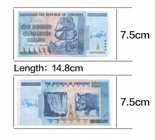 Cechy charakterystyczne: Na awersie widnieje charakterystyczna formacja skalna Balancing Rocks oraz napis "ONE HUNDRED QUINTILLION DOLLARS". Na rewersie przedstawiony jest nosorożec i Wodospady Wiktorii.