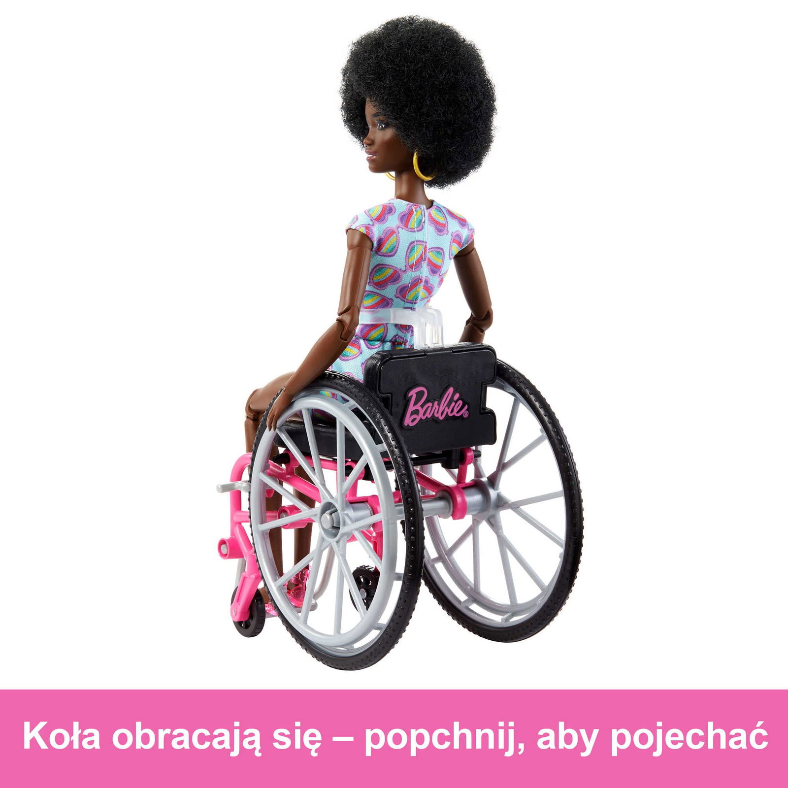 Barbie na różowym wózku inwalidzkim jest gotowa na nowe przygody. Pomarańczowa rampa ułatwia jej poruszanie się po domku dla lalek Barbie Dreamhouse (sprzedawany oddzielnie, zależnie od dostępności).