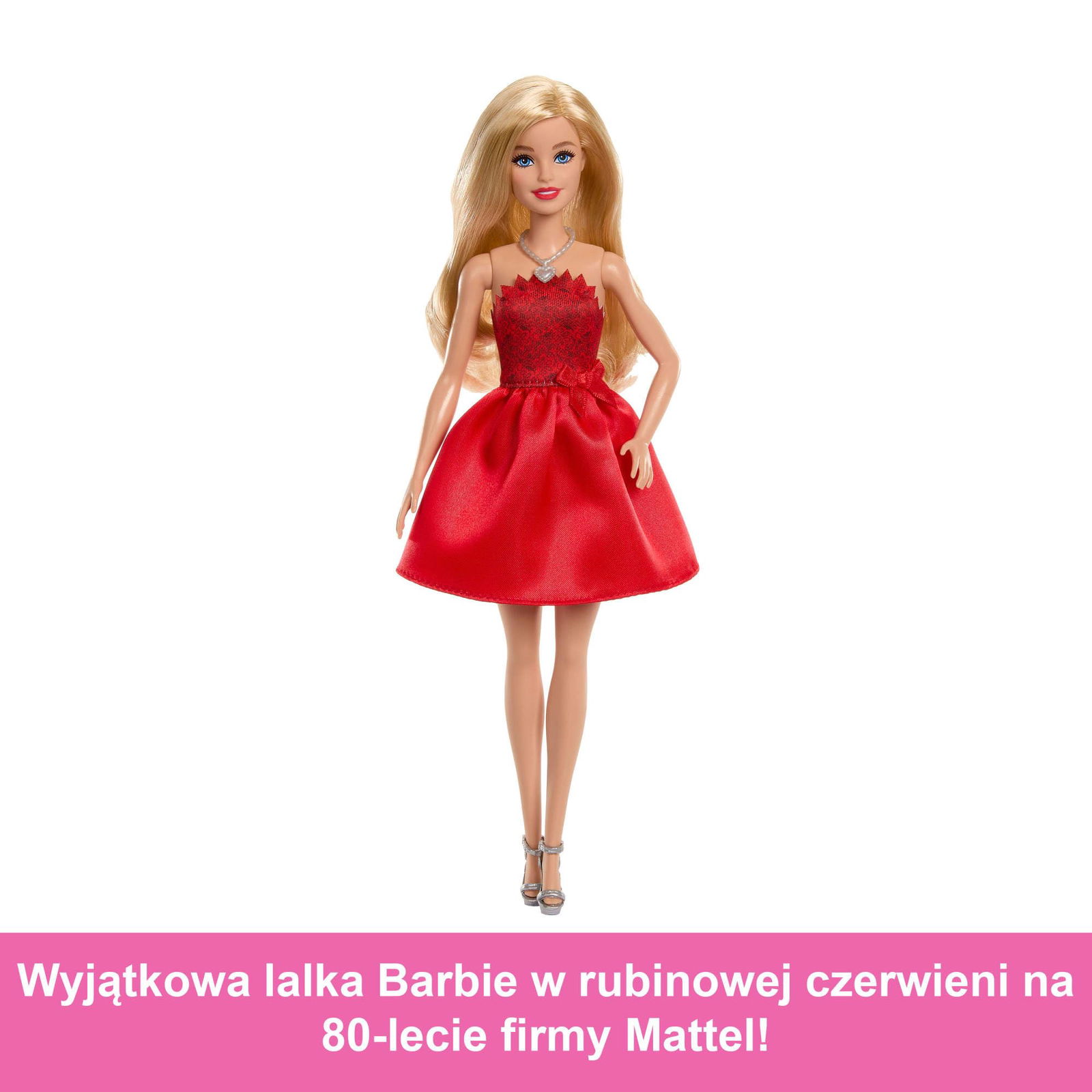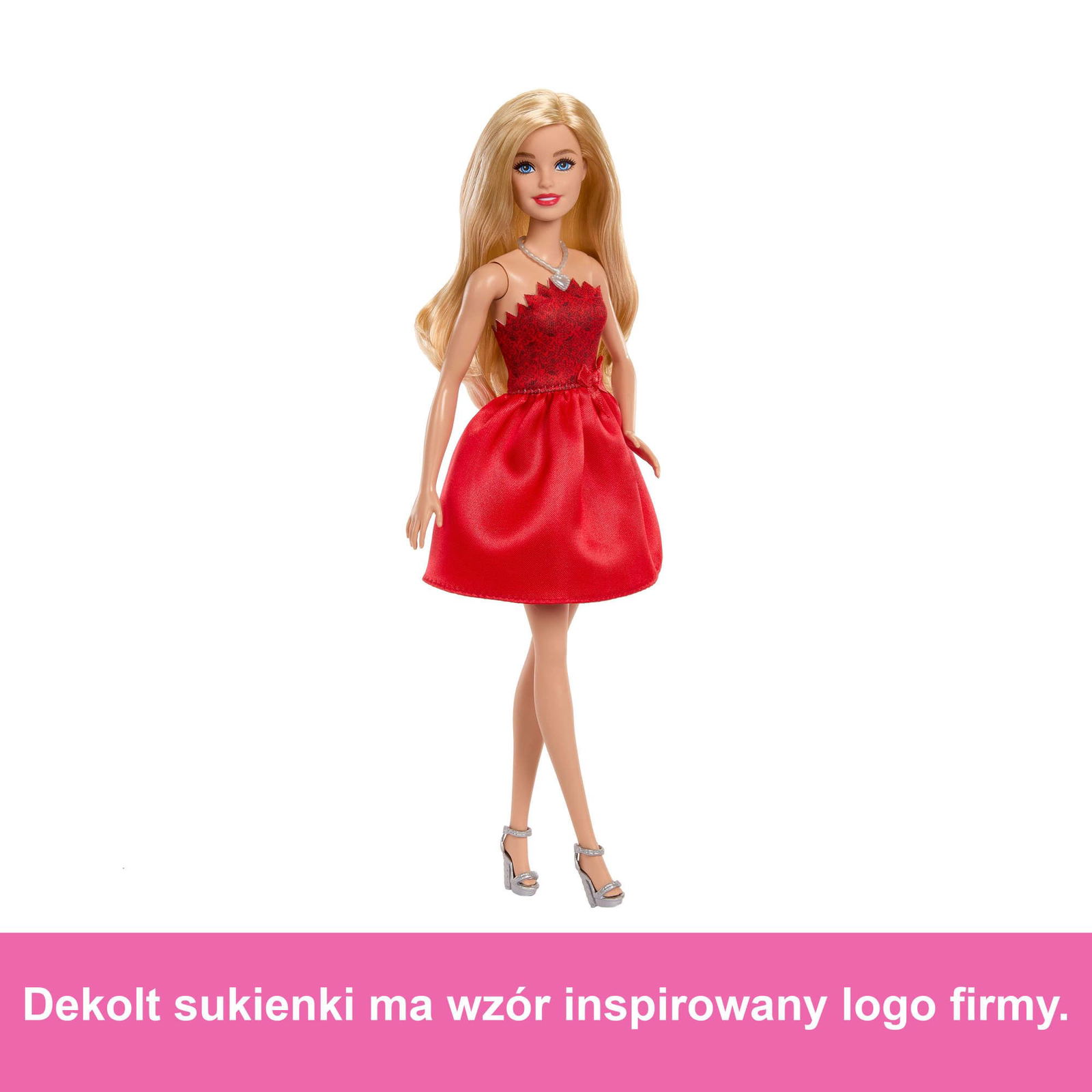 Lalka Barbie ma na sobie rubinową sukienkę zdobioną pięknymi detalami, w tym dekoltem nawiązującym do kultowego „kółka zębatego” znanego z logo Mattel.
