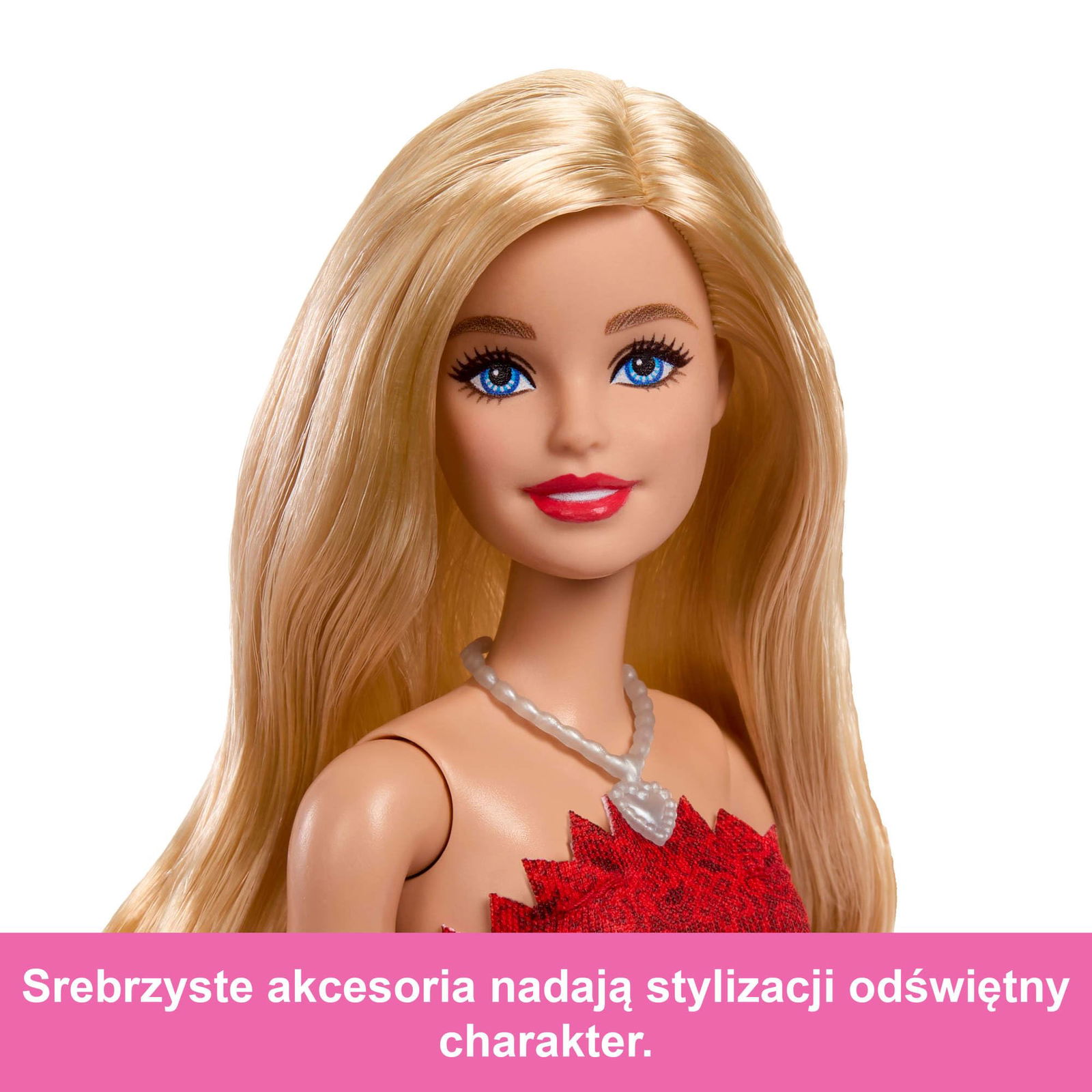 Wyjątkową stylizację lalki uzupełniają akcesoria – srebrzyste sandałki na obcasie i naszyjnik.