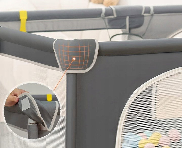 ✅ Bezpieczne akcesoria – Ochronne pokrowce na narożnikach oraz tkanina Oxford 150D są odporne na rozdarcia, a dodatkowe pierścienie trakcyjne pomagają dziecku w staniu i nauce chodzenia.