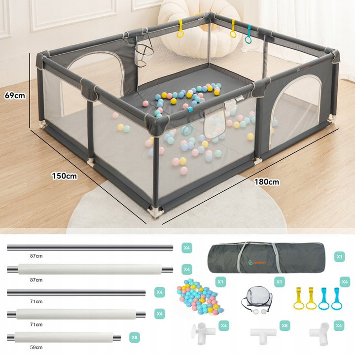 ⭐ COMOMY Bardzo Duży Kojec dla Dzieci 180x200x66 cm z Piłkami ⭐