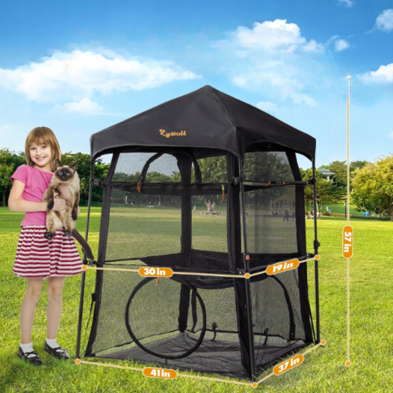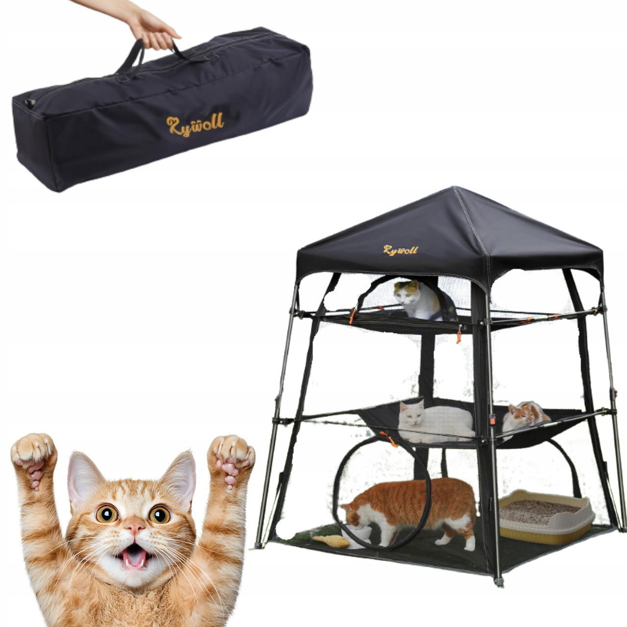 Przestronny, składany kojec Rywell to idealne rozwiązanie dla właścicieli kotów, którzy chcą zapewnić swoim pupilom bezpieczne i wygodne miejsce do zabawy zarówno w domu, jak i na świeżym powietrzu. Trzypoziomowa konstrukcja z pięcioma dużymi oknami wentylacyjnymi gwarantuje odpowiednią cyrkulację powietrza i dużą ilość naturalnego światła. Wykonany z materiałów odpornych na warunki atmosferyczne kojec świetnie sprawdzi się na patio, w ogrodzie, podczas kempingu czy wakacyjnych wyjazdów.