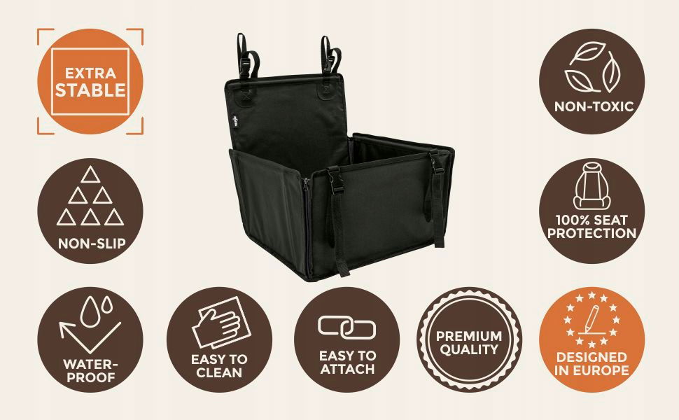Dzięki czterem pasom i mocowaniu ten transporter samochodowy dla psa jest wyjątkowo stabilny i bezpieczniejszy niż większość innych tego typu produktów. Nasz fotel dla psa do samochodu zaopatrzony jest w pas bezpieczeństwa o regulowanej długości, który utrzyma pupila bezpiecznie na swoim miejscu.