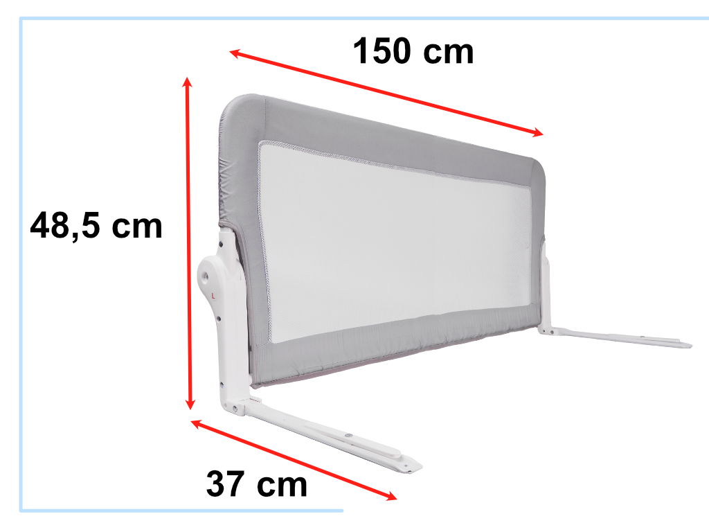 PROSTY MONTAŻ - Montaż barierki jest niesamowicie prosty! Należy rozpocząć od jej złożenia, wkładając odpowiednie elementy ramy w otwory materiałowego obszycia siatki. Następnie wystarczy, że uniesiesz materac łóżka i włożysz wystające podstawki barierki pod niego!