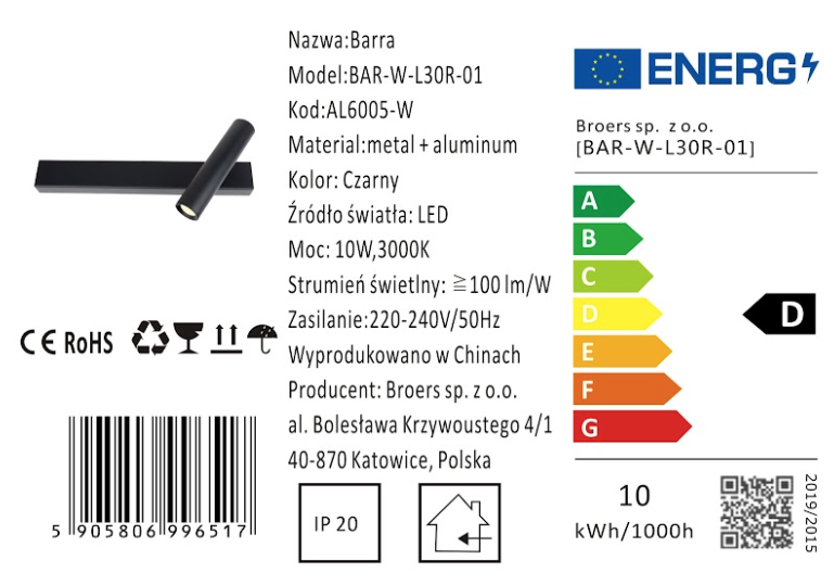 - Prosty Montaż: Dzięki kompatybilności z standardowym zasilaniem 220-240V/50Hz, montaż kinkietu "Barra" jest szybki i łatwy.