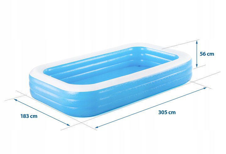 Basen o wymiarach 305 x 183 x 56 cm charakteryzuje się prostokątnym kształtem. Basen jest na tyle duży, że spokojnie może bawić się w nim cała rodzina. Ten nadmuchiwany basen montuje się w ciągu kilku minut, a także jest wyposażony w łatwy w użyciu zawór spustowy do spuszczania wody,