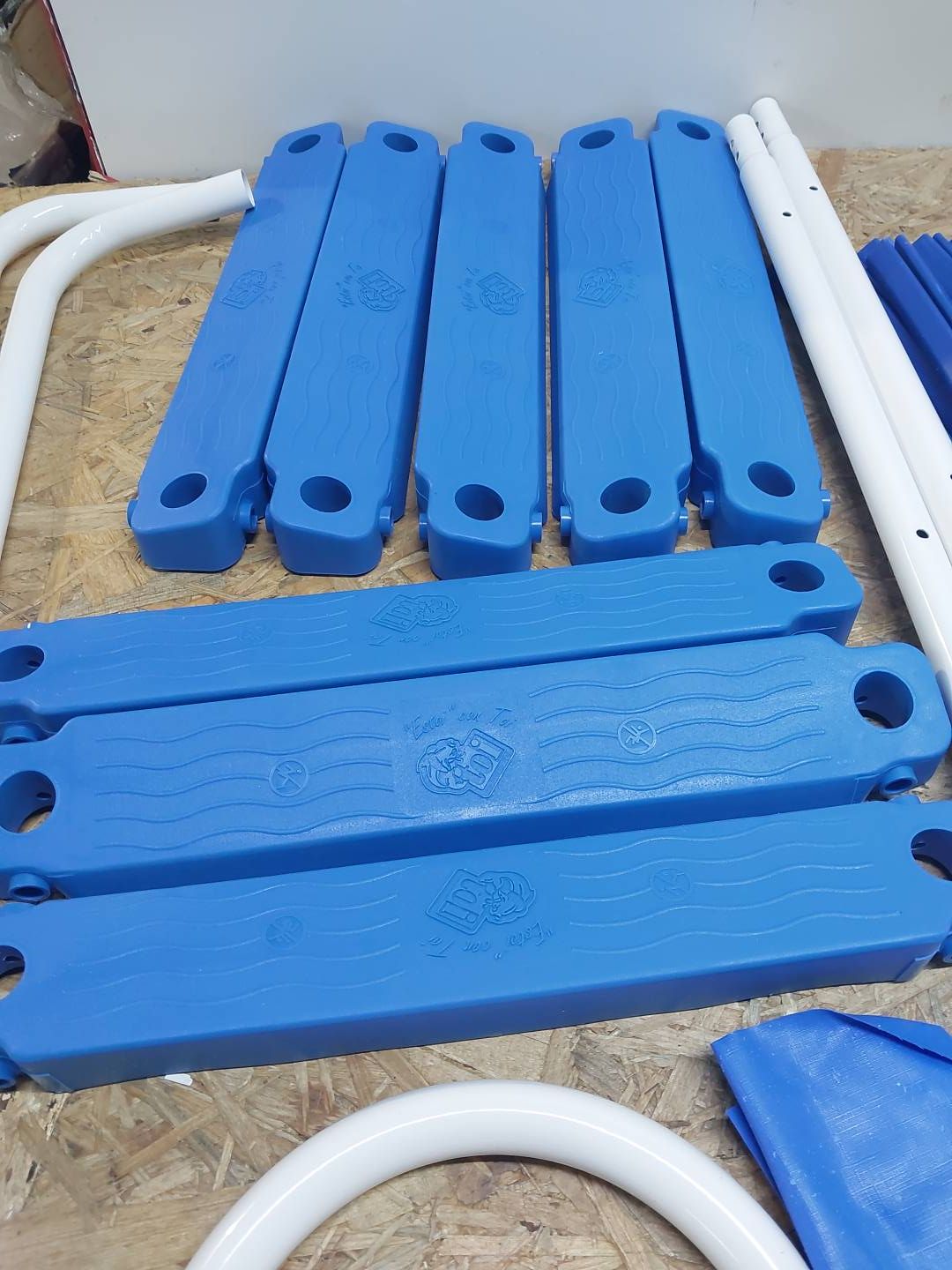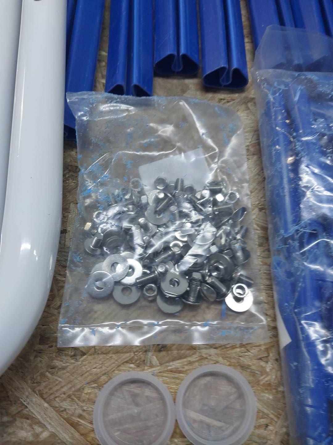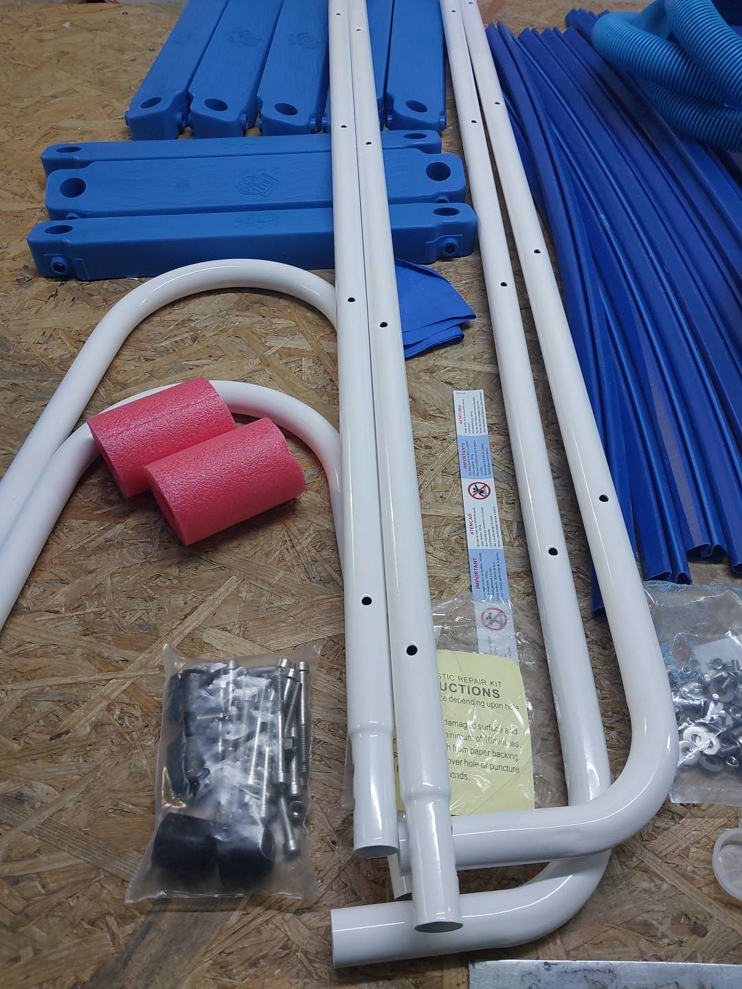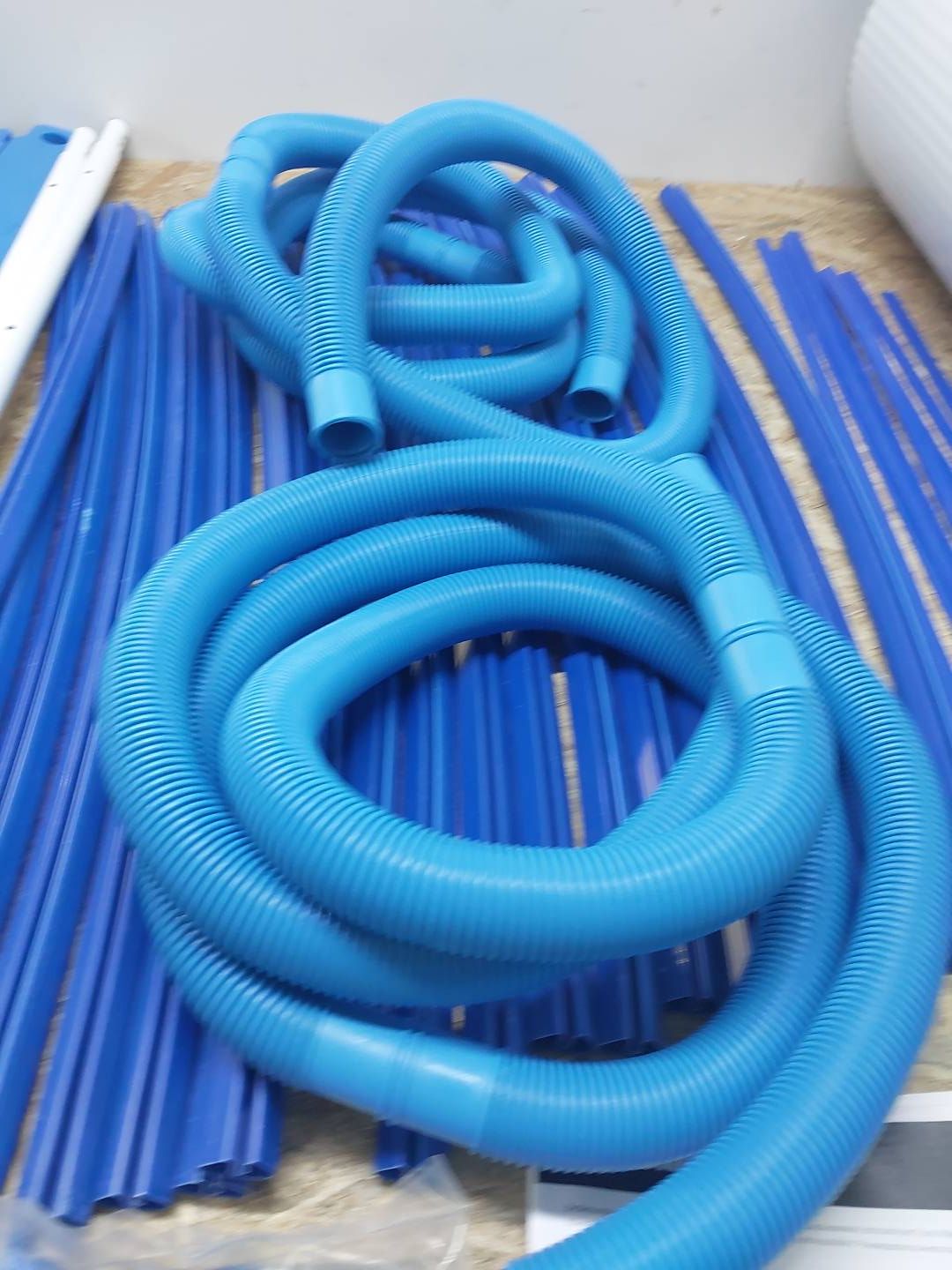 PRODUKT POSIADA PORYSOWANY METALOWY ELEMENT . Z CZTERECH RUREK DO PORĘCZY DWIE SĄ WYGIĘTE. BASEN KOMPLETNY