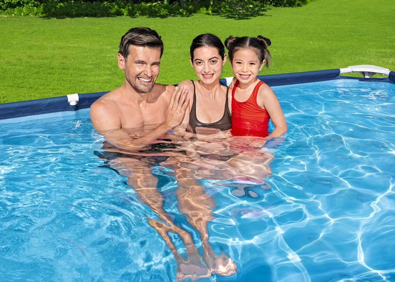Wystarczy tylko rozwinąć powłokę, złożyć stelaż i napełnić basen wodą.