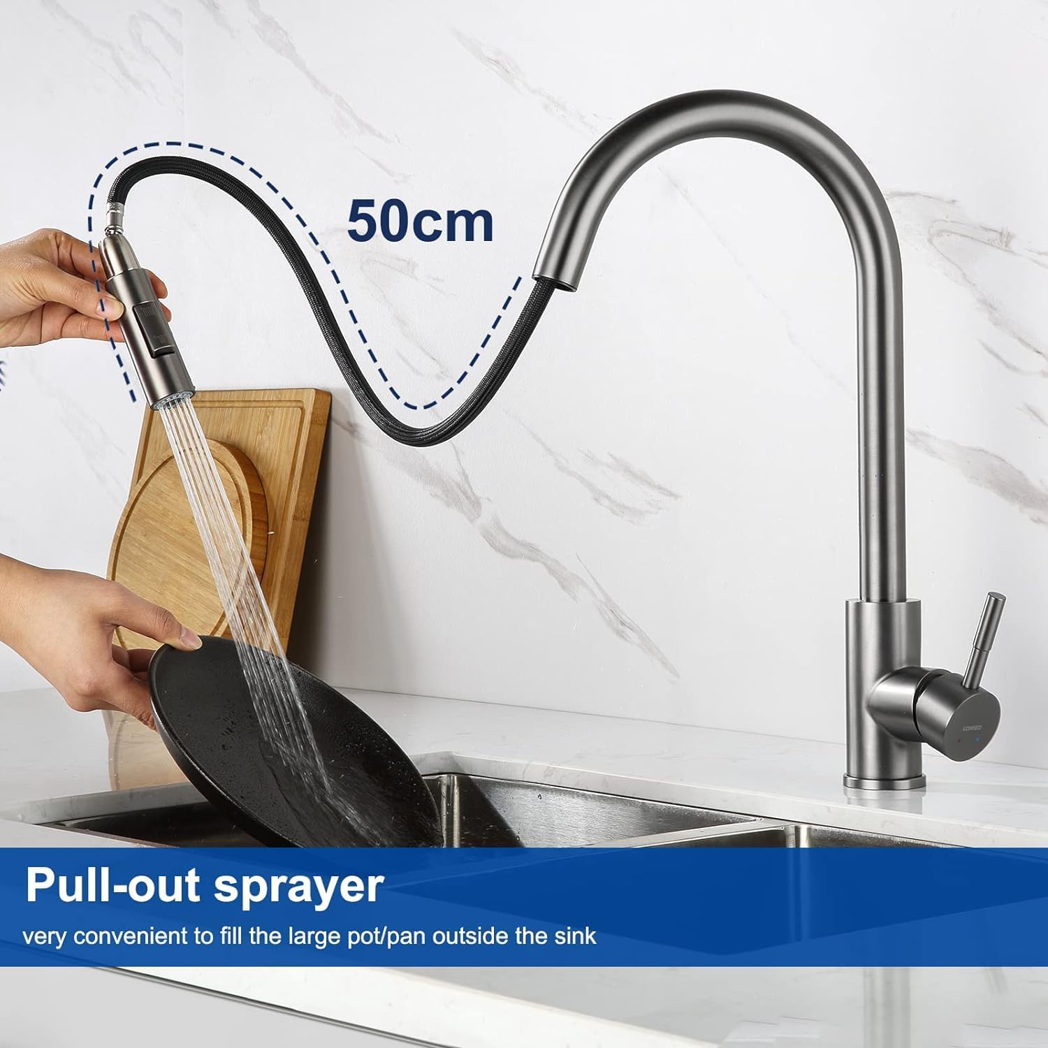 Wysuwana armatura kuchenna to niezastąpiona pomoc w każdej kuchni. Dzięki zasięgowi 50 cm łatwo dotrzesz do każdego zakamarka zlewozmywaka, co ułatwia napełnianie dużych garnków tuż przy miejscu gotowania. Idealny wybór dla zlewozmywaków dwu- i wielokomorowych.
