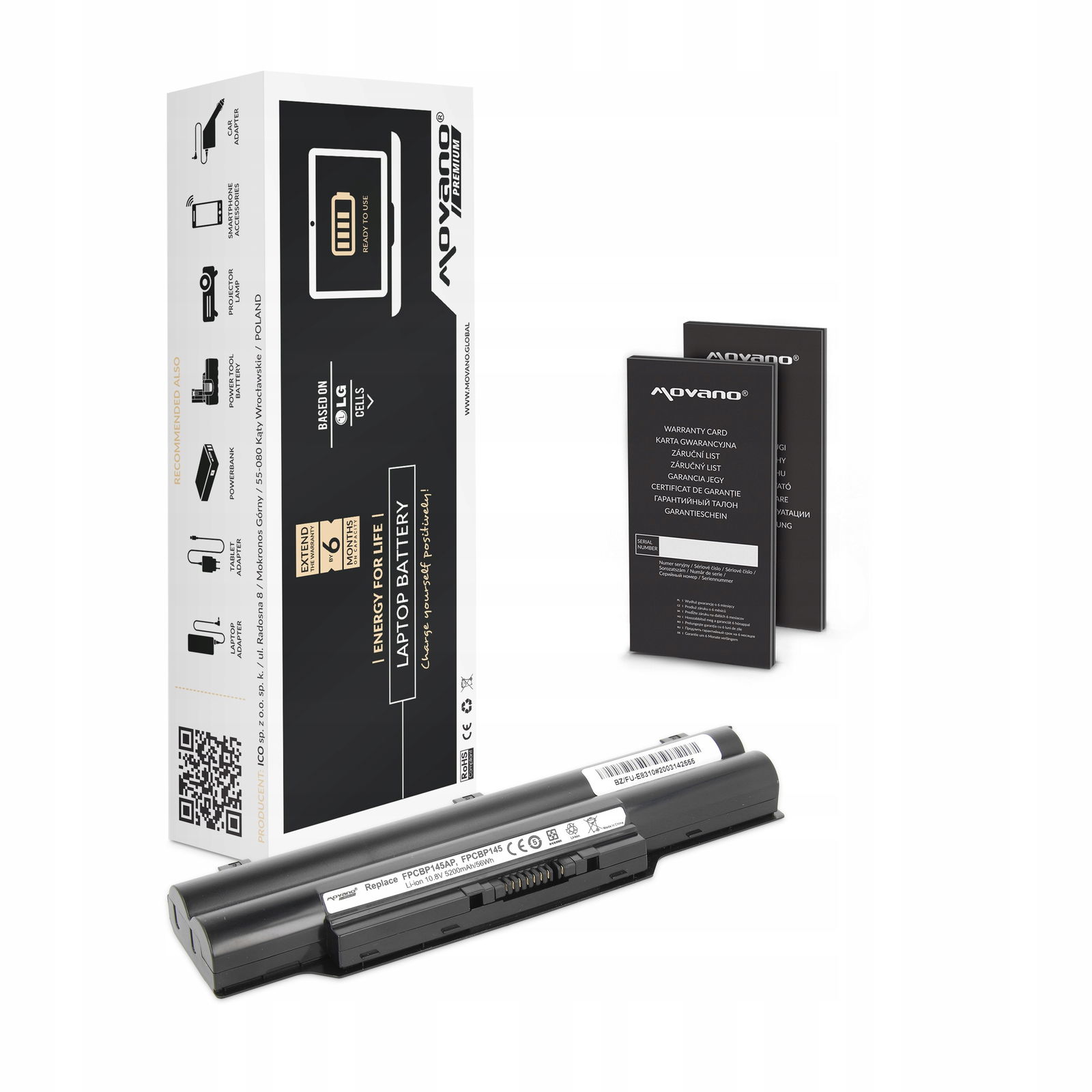 Movano z certyfikatem jakości CE, ROHS. Akumulator wyprodukowany w oparciu o ogniwa litowo-jonowe klasy A+ marki LG używane przez czołowych producentów oryginalnych baterii do laptopów. Bateria wyposażona jest w zabezpieczenie chroniące ją przed: przepięciem, przegrzaniem, zwarciem, przeciążeniem prądowym, głębokim rozładowaniem oraz przeładowaniem.