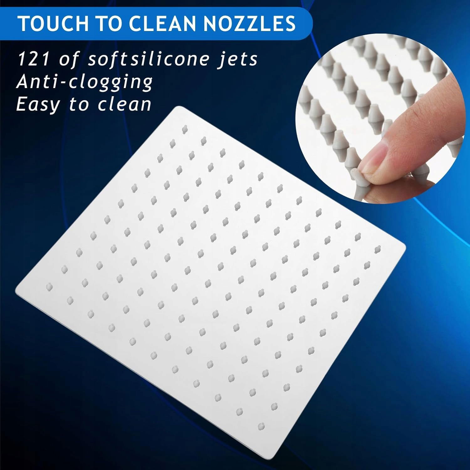 - SAMOCZYSZCZĄCE SILIKONOWE DYSZE - Samoczyszczące miękkie silikonowe dysze o konstrukcji 121 silikonowych dysz, które zapewniają wysoki przepływ prysznica. Silikon spożywczy używany w dyszach pozwala na łatwe wycieranie osadów wapnia i wapnia, zapewniając bezpieczeństwo i zdrowie podczas kąpieli.