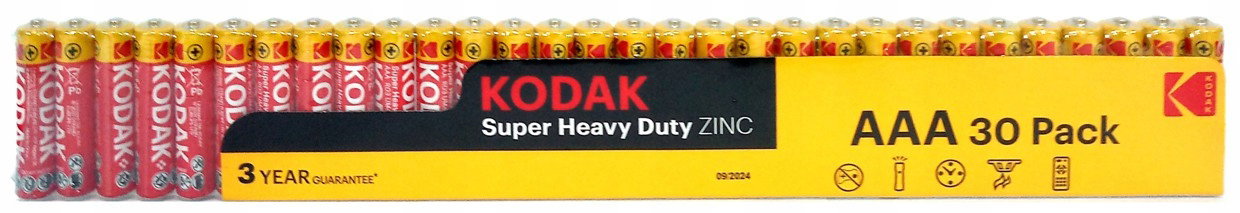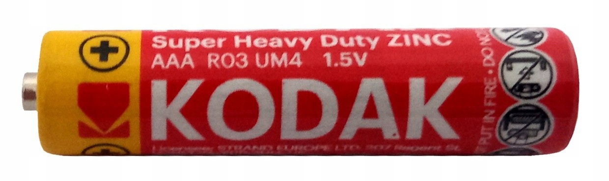 Baterie cynkowo-węglowe AAA (R3) - małe paluszki, marki Kodak Super Heavy Duty ZINC. Baterie przeznaczone do długoterminowego użytkowania bez konieczności ich ciągłej wymiany w urządzeniach o małym zapotrzebowaniu na prąd takich jak: zabawki, zegarki, czujniki dymu, piloty itp.