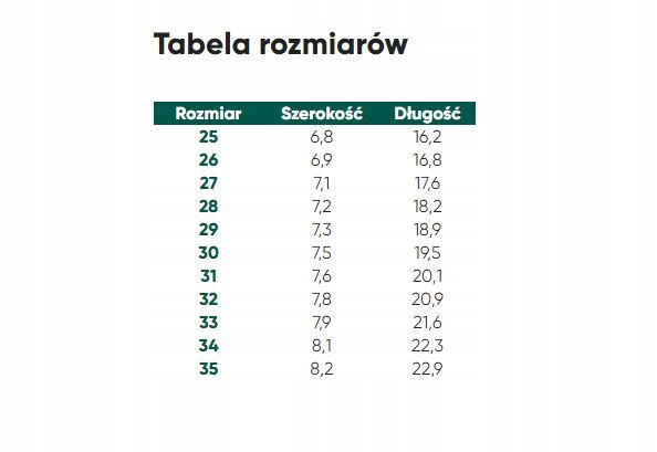 Tabela rozmiarów wskazuje długość i szerokość wkładki buta w centymetrach.