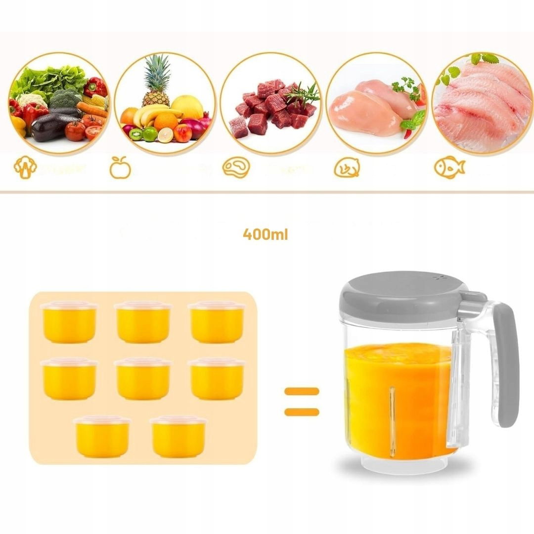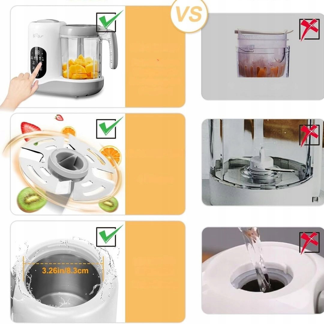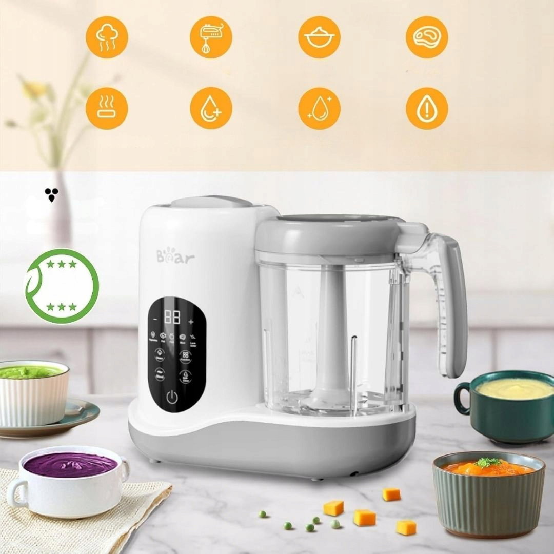 - Zastosowanie: urządzenie służy do szybkiego przygotowywania posiłków dla niemowląt poprzez gotowanie na parze i miksowanie składników. Umożliwia tworzenie zdrowych dań z warzyw, owoców, mięsa i ryb w jednym urządzeniu. Ułatwia codzienne karmienie dziecka świeżymi, domowymi posiłkami.