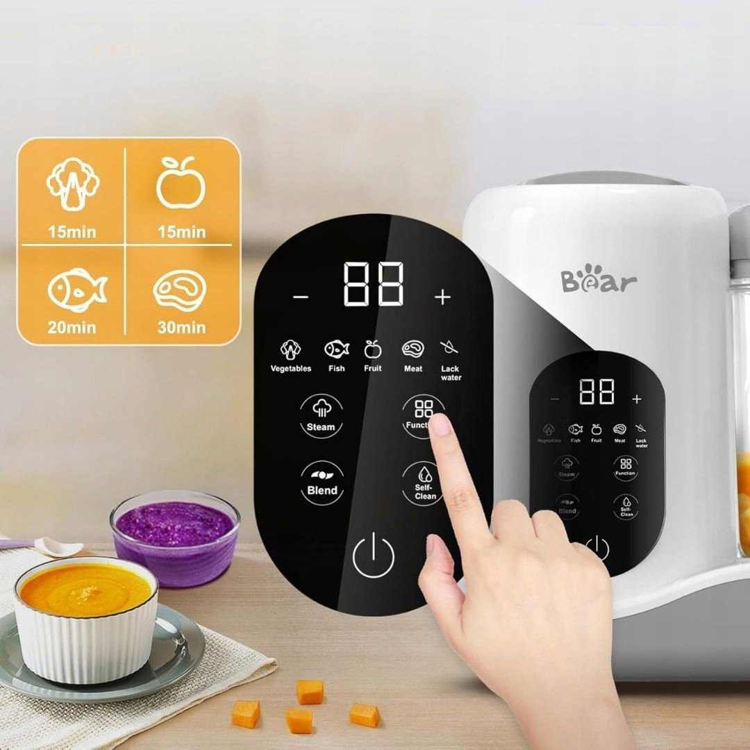 - Wielofunkcyjność i wygoda użytkowania: Bear Baby Food Maker łączy funkcję parowaru i miksera w jednym urządzeniu, eliminując potrzebę stosowania dodatkowych akcesoriów, takich jak plastikowy kosz. Nie wymaga przekładania składników ani używania dodatkowego wyposażenia. Specjalny cykl przetwarzania pozwala zachować składniki odżywcze, aromaty i witaminy, zapewniając zdrowe i smaczne posiłki przygotowywane samodzielnie dla dziecka.