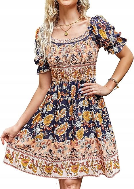BebreezChic damska letnia krótka sukienka Boho z krótkim rękawem kwadratowy dekolt wysoka talia sukienka plażowa Mini sukienka