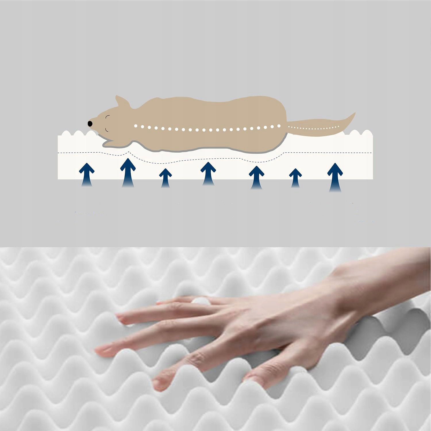 Wypełnienie z profilowanej pianki skutecznie rozkłada ciężar ciała zwierzęcia, odciążając stawy i kręgosłup. Specjalna struktura przypominająca karton na jajka wspiera cyrkulację powietrza oraz amortyzuje nacisk, co jest szczególnie korzystne dla starszych psów i tych z problemami ruchowymi.