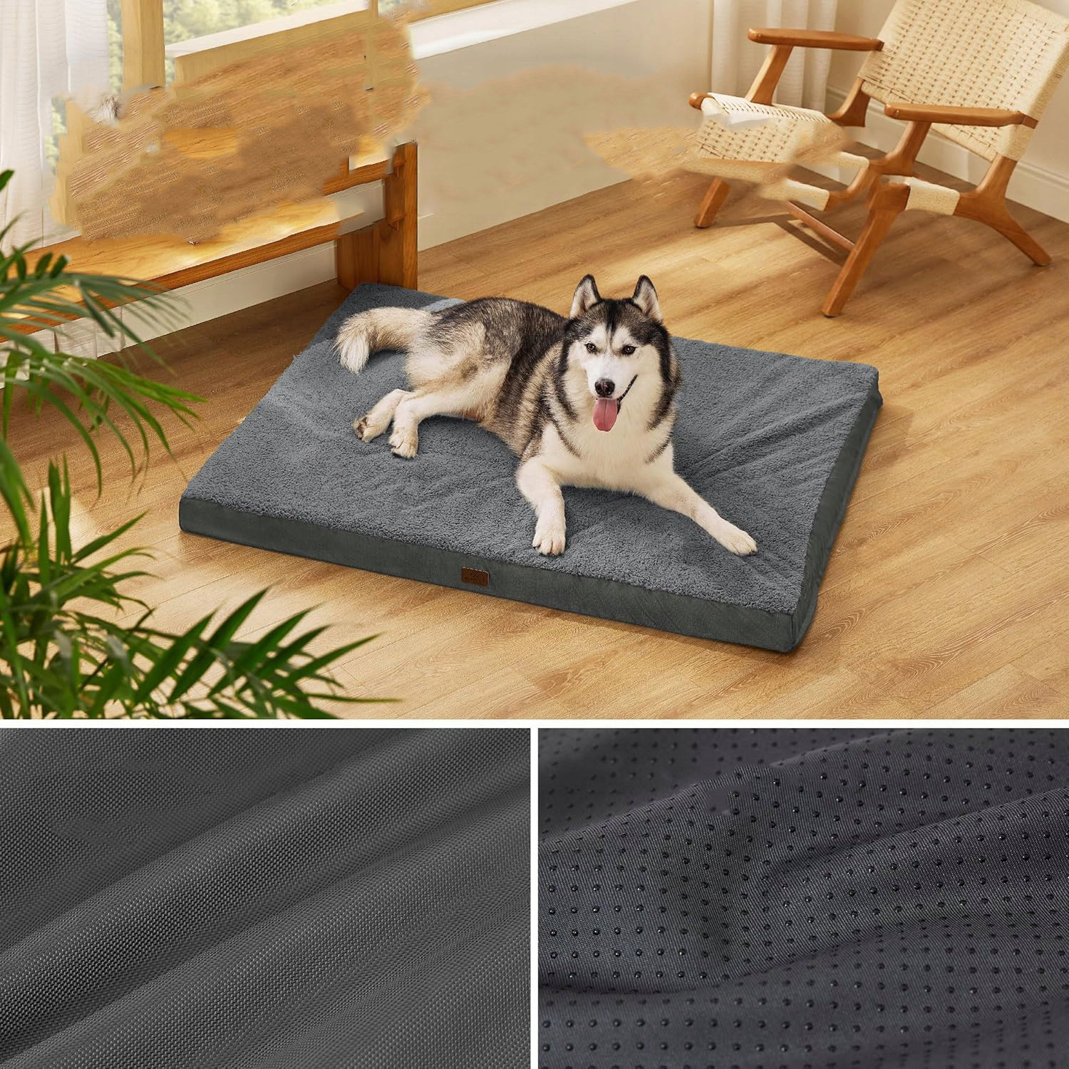 Legowisko wyposażono w zdejmowany pokrowiec z dwóch różnych materiałów – miękkiego pluszu sherpa, który zapewnia ciepło w chłodniejsze dni, oraz chłodniejszej tkaniny typu Oxford idealnej na lato. To praktyczne rozwiązanie dopasowuje się do zmieniających się warunków.