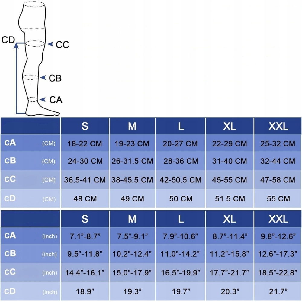 - Poziom kompresji: 15-20 mmHg (mocna, stopniowana kompresja)