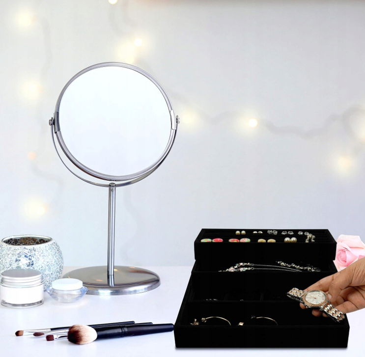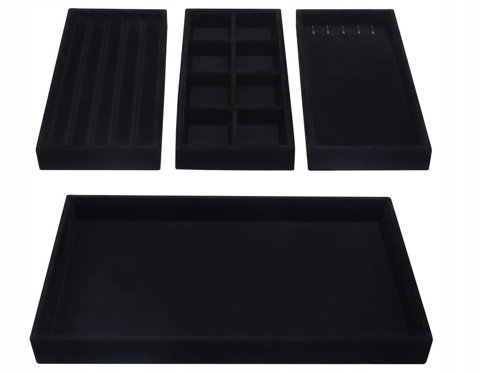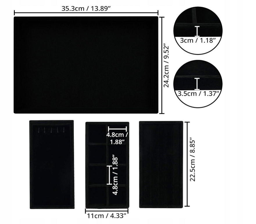 - ✴️ Organizer biżuterii – zestaw 4 tacek-W komplecie 1 duża tacka bazowa 35,3×24,2×3,5 cm oraz 3 mniejsze tacki 22,5×11×3 cm, które można umieścić wewnątrz podstawy.
