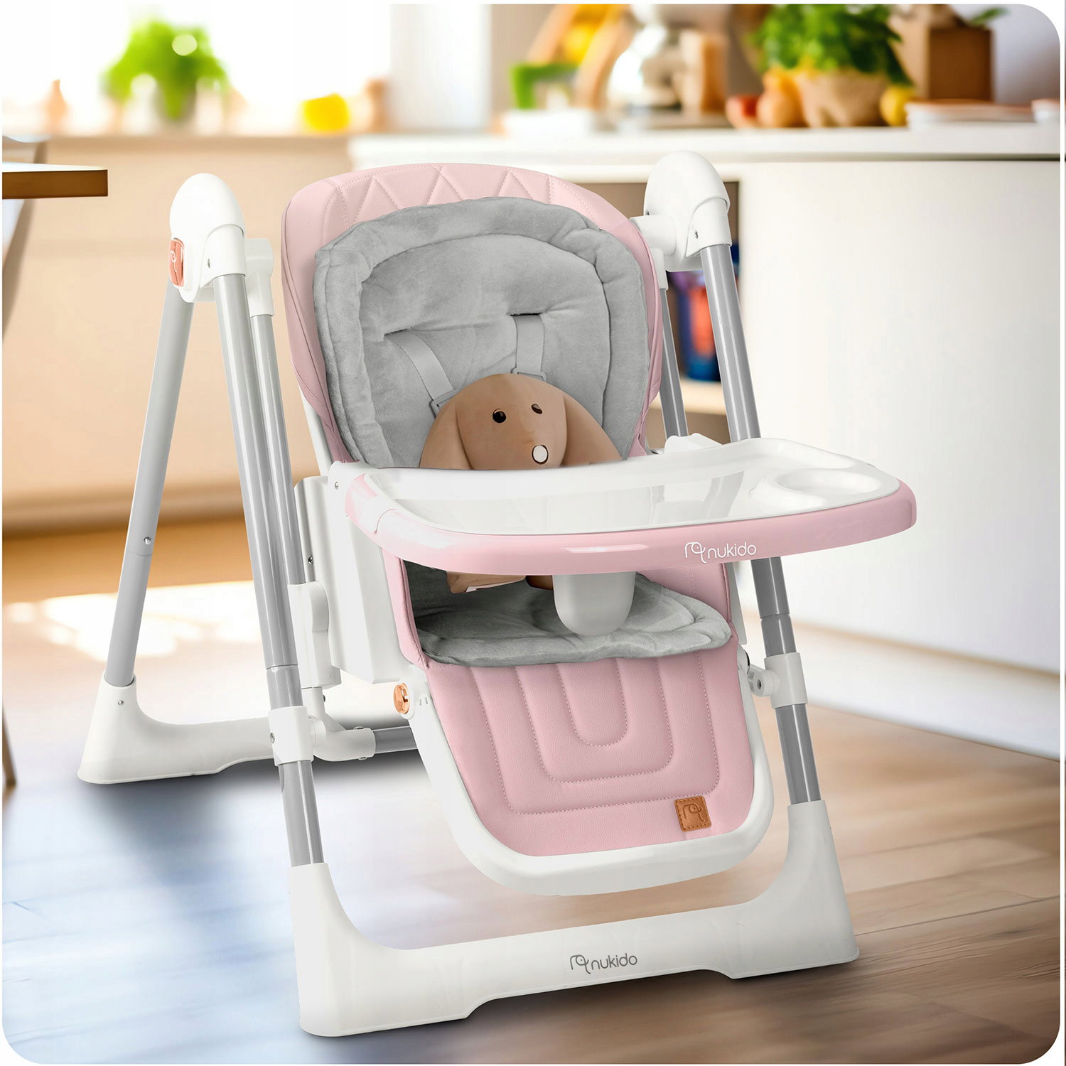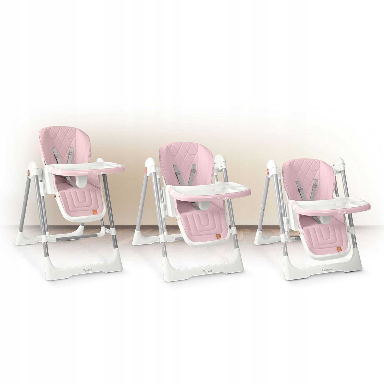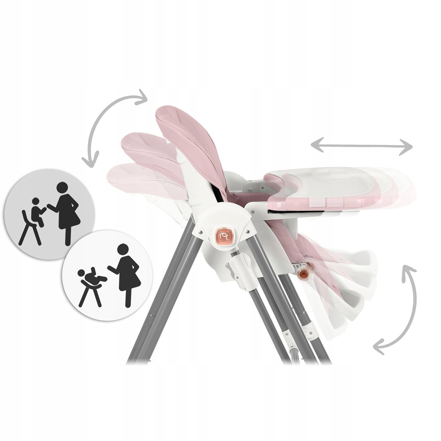 Dodatkowe informacje: Antypoślizgowe nóżki, Funkcja: oddzielny stoliczek+krzesełko, Koła, Pasy bezpieczeństwa, Regulacja oparcia, Regulacja wysokości, Regulowany podnóżek, Wkładka dla niemowląt, Zdejmowane pokrycie, Zdejmowany blat