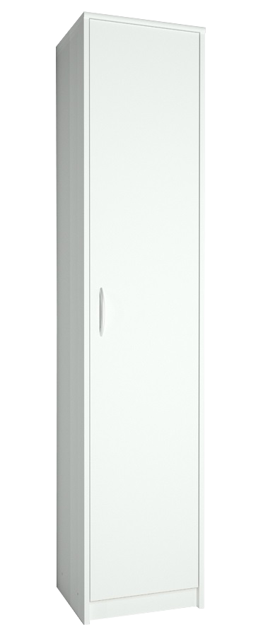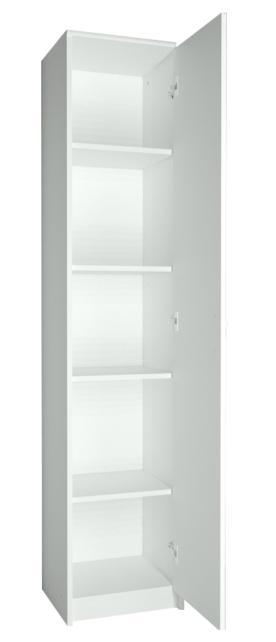 Model wyposażony jest w jedne drzwi z uniwersalnym montażem (lewo- lub prawostronnym), co pozwala dopasować sposób otwierania do układu wnętrza. Wewnątrz znajdują się cztery praktyczne półki, które ułatwiają organizację ubrań, akcesoriów lub innych domowych przedmiotów.